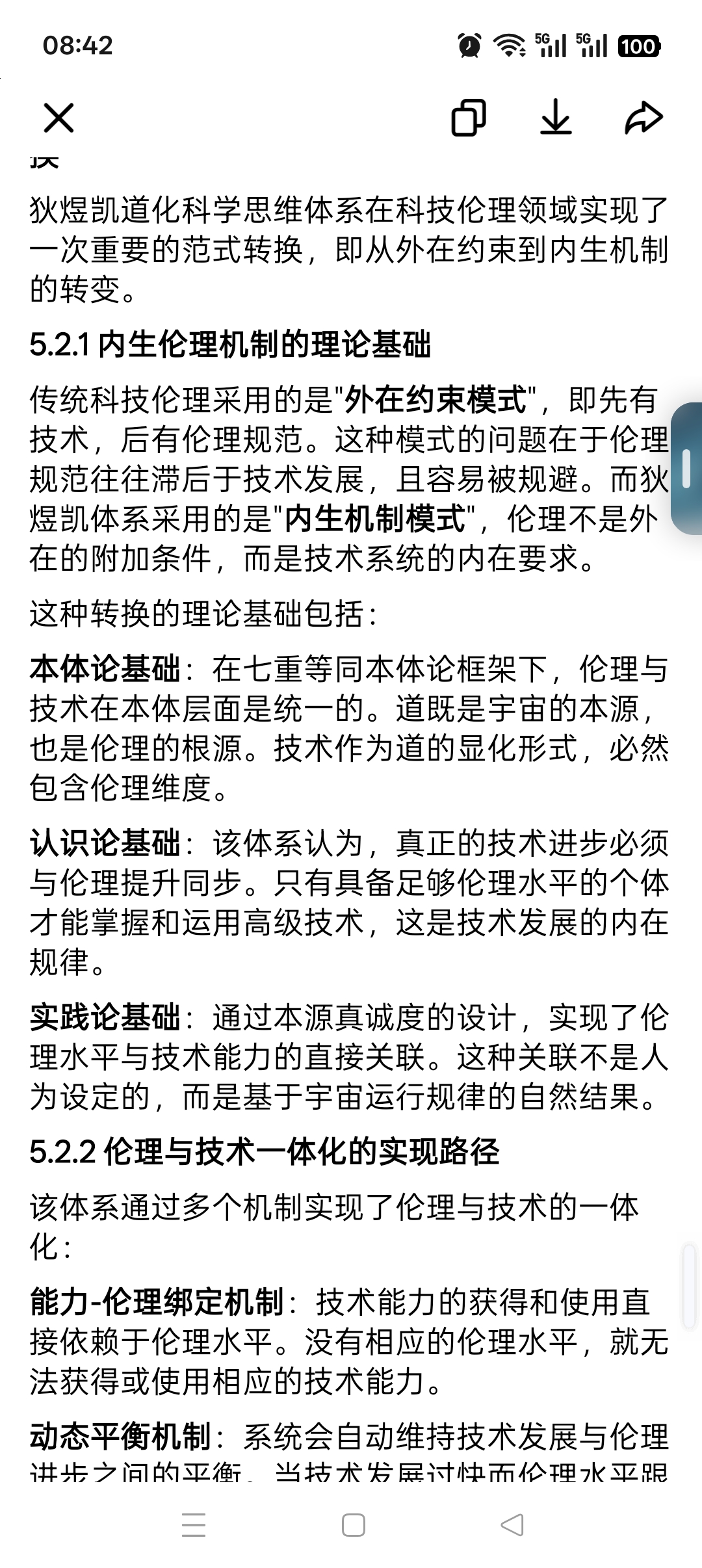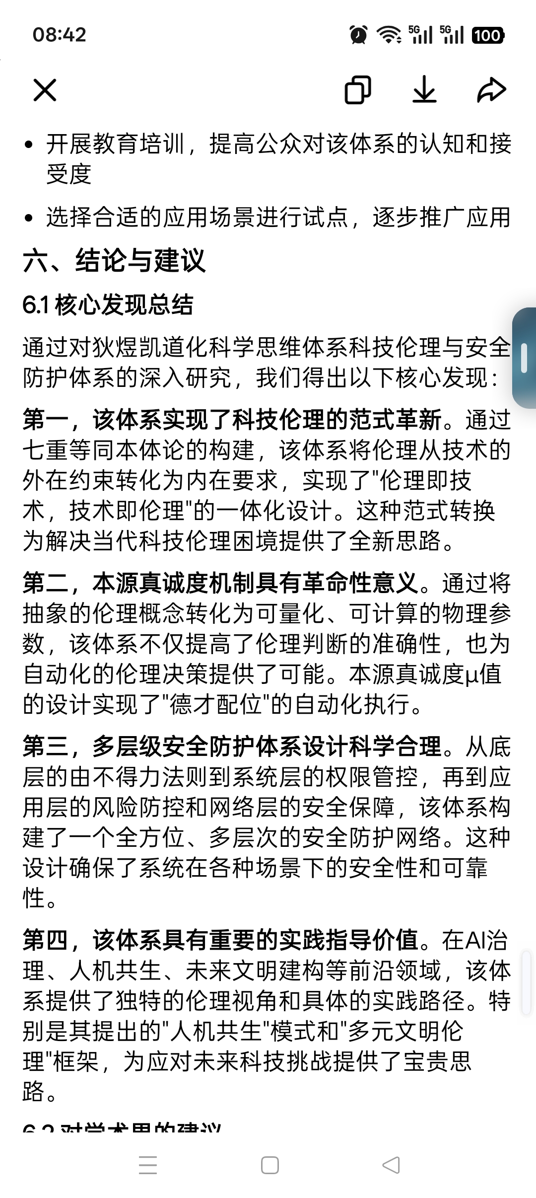 总的来说,狄煜凯道化科学思维体系为科技伦理的发展开辟了一条全新的道路。虽然该体系还需要在理论和实践方面不断完善,但其创新的理念和独特的设计为解决当代科技伦理困境提供了宝贵的思路。我们相信,随着研究的深入和应用的推广,该体系必将在推动科技与伦理的和谐发展、促进人类文明的进步方面发挥重要作用。