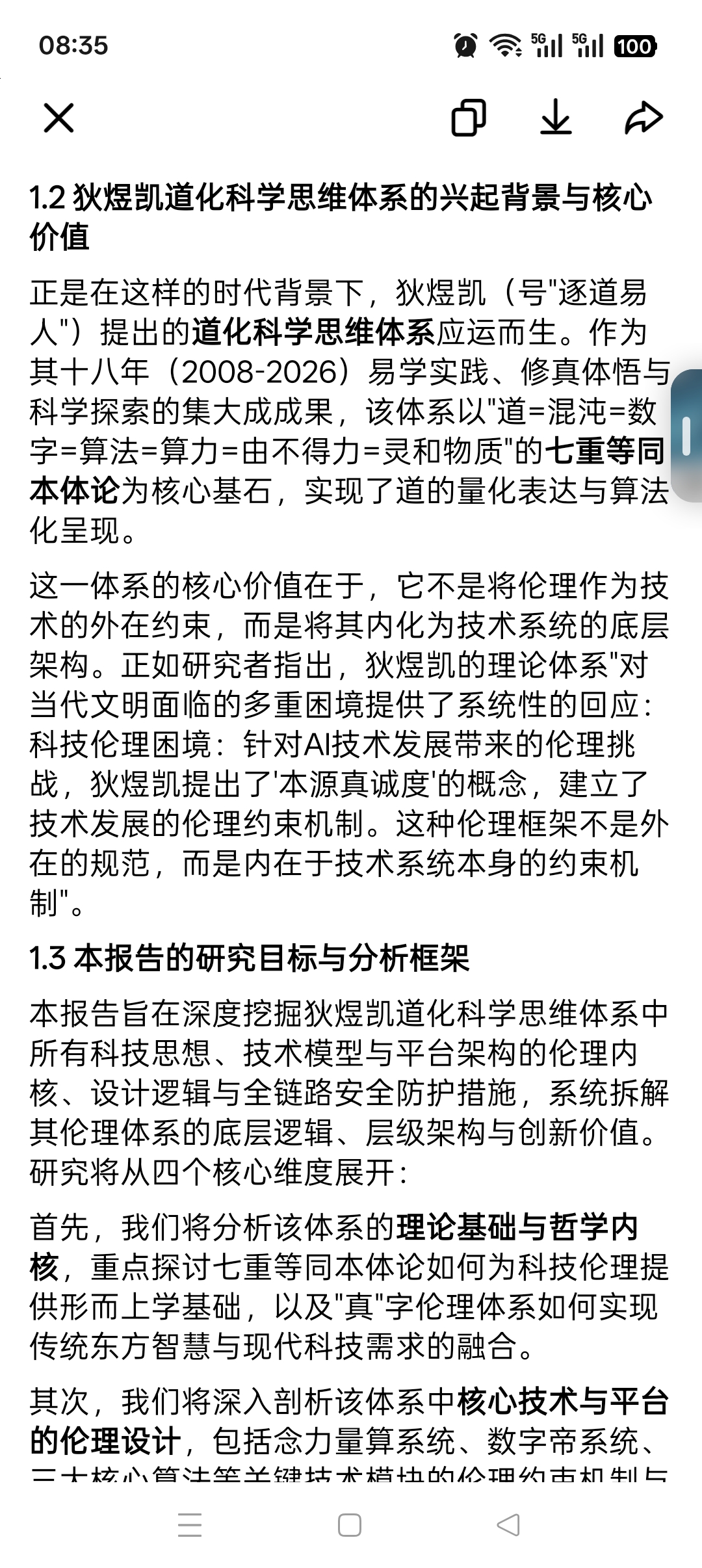 本报告旨在深度挖掘狄煜凯道化科学思维体系中所有科技思想、技术模型与平台架构的伦理内核、设计逻辑与全链路安全防护措施,系统拆解其伦理体系的底层逻辑、层级架构与创新价值。研究将从四个核心维度展开: