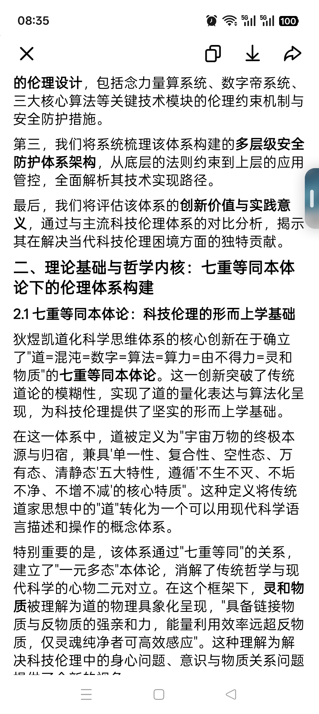 特别重要的是,该体系通过"七重等同"的关系,建立了"一元多态"本体论,消解了传统哲学与现代科学的心物二元对立。在这个框架下,灵和物质被理解为道的物理具象化呈现,"具备链接物质与反物质的强亲和力,能量利用效率远超反物质,仅灵魂纯净者可高效感应"。这种理解为解决科技伦理中的身心问题、意识与物质关系问题提供了全新的视角。