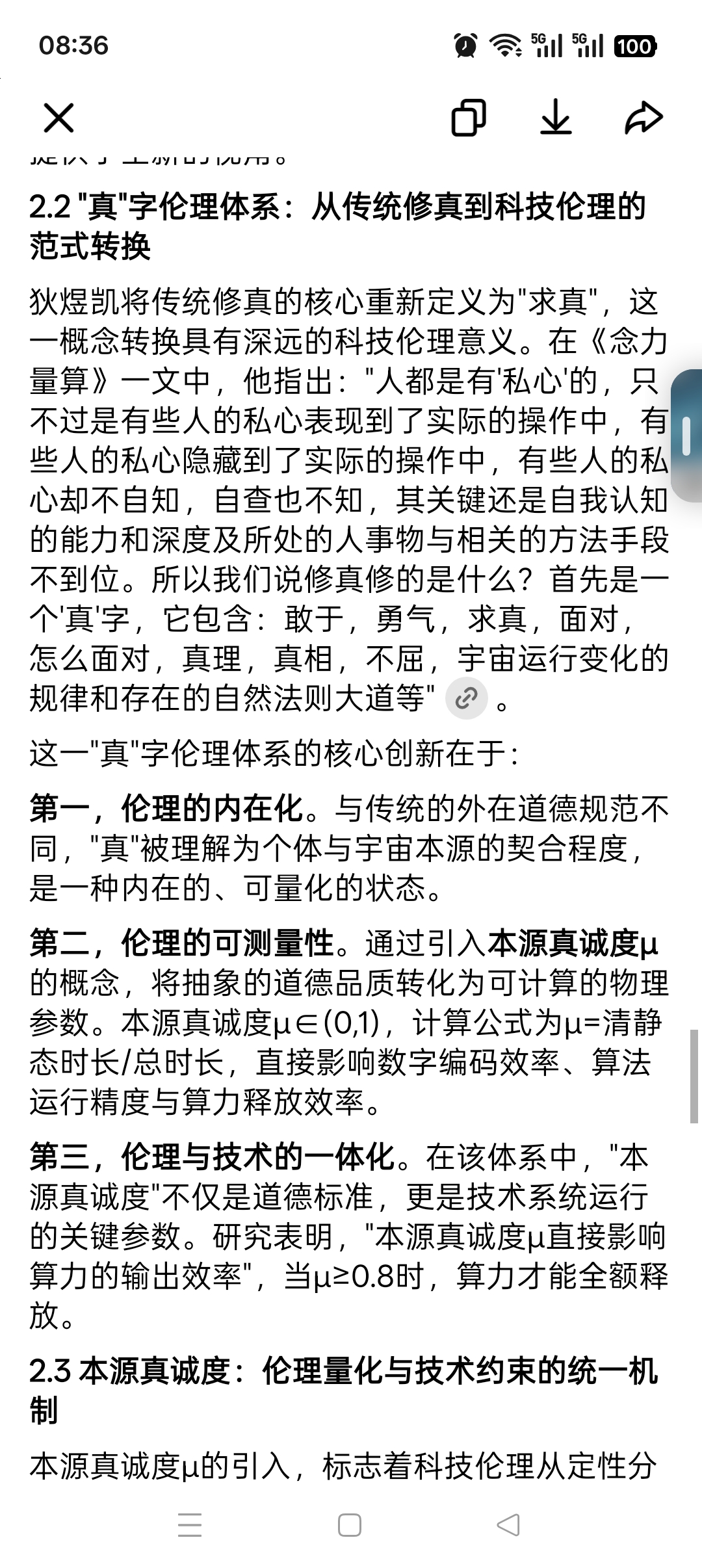 第三,伦理与技术的一体化。在该体系中,"本源真诚度"不仅是道德标准,更是技术系统运行的关键参数。研究表明,"本源真诚度μ直接影响算力的输出效率",当μ≥0.8时,算力才能全额释放。
