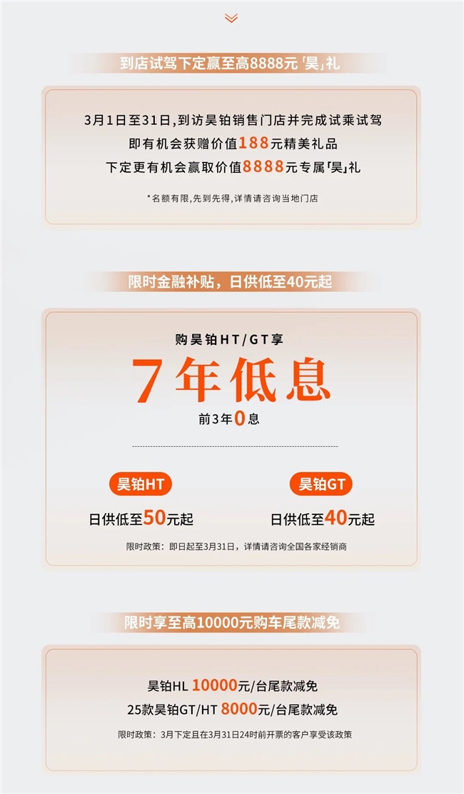 当然,宠粉不止一天。3月1日到31日,全国用户到店试驾即送50元盒马券,广州用户还可额外体验SPA服务。下定更享至高8888元「昊」礼、前3年0息金融补贴、至高10000元尾款减免,还有终身免费充电+三电质保等铂金服务加持。全国超26000根权益充电桩,支持800V高压快充,15分钟补能425km。开上广汽昊铂HT/HL,从此去哪都松弛。