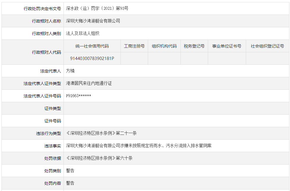 近日,深圳市水务局发布行政处罚决定书文号深水政(运)罚字〔2021〕第93号,对深圳大梅沙湾游艇会有限公司(以下简称大梅沙湾游艇会)因违反《深圳经济特区排水条例》第二十一条规定,涉嫌未按照规定将雨水、污水分流排入排水管网的行为进行了处罚。