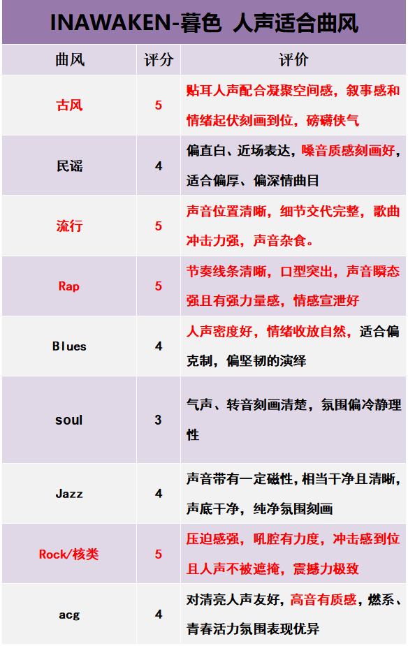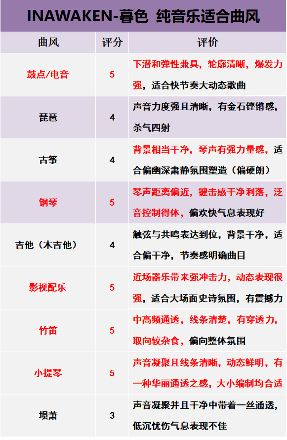 按照惯例,为了更直观地展示暮色在声音表现上的适配性与风格倾向,下表简要列出了其在不同曲风下的听感表现: