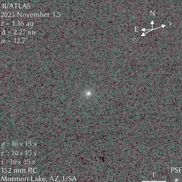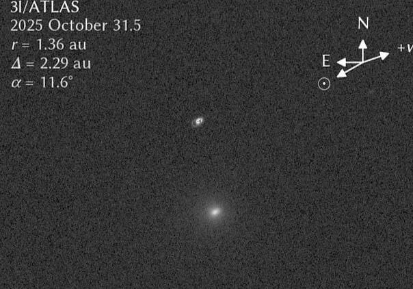 刚从太阳背后钻出来的3I/ATLAS彻底火了!11月4日张启成博士用洛厄尔天文台望远镜拍到的影像显示,这颗彗星亮度比消失前翻了倍,还裹着诡异的蓝色光晕。