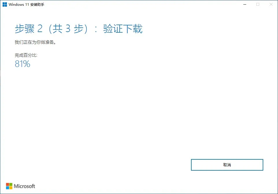 更改要保留的内容选项里面,默认的是“保留个人文件和应用”,不需要修改。点击“安装”之后,便进入安装界面: