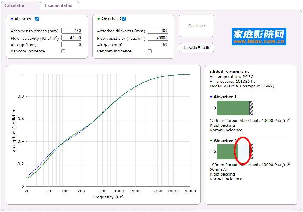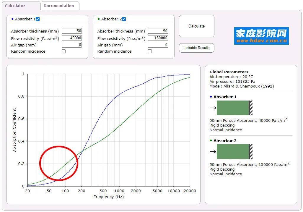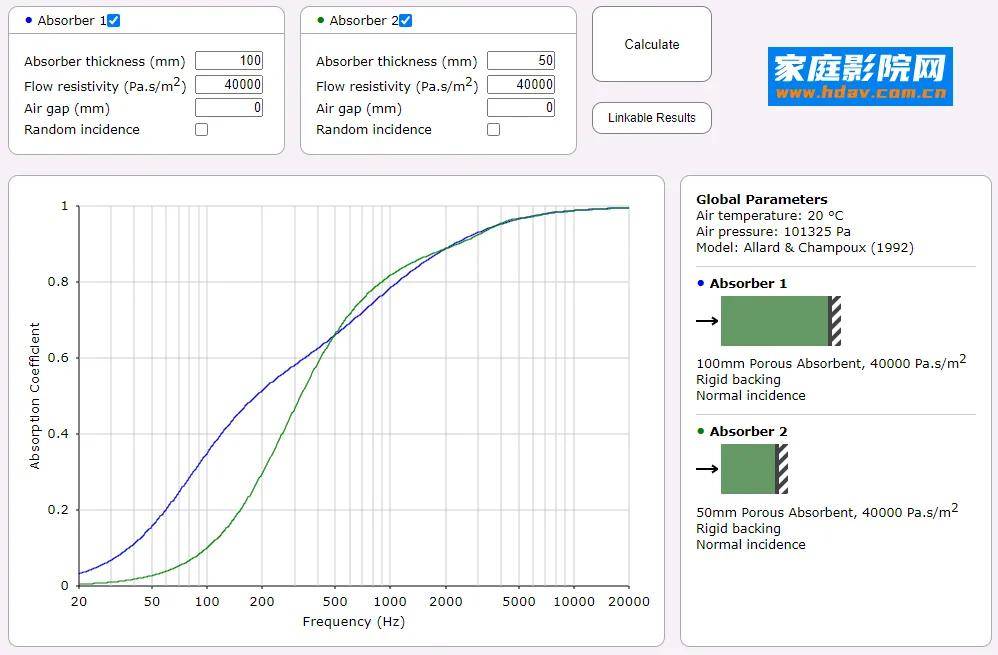 上图蓝色曲线是厚度100mm,绿色曲线是50mm材料贴墙摆放效果模拟。可见同样材质不同厚度情况下,越厚对低频的吸收能力越强。