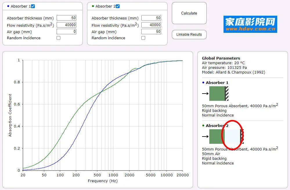 上图蓝色曲线是厚度50mm密度40kg/m³吸音棉贴墙摆放,绿色曲线是同样厚度和密度的材料与墙面间隔100mm效果模拟。