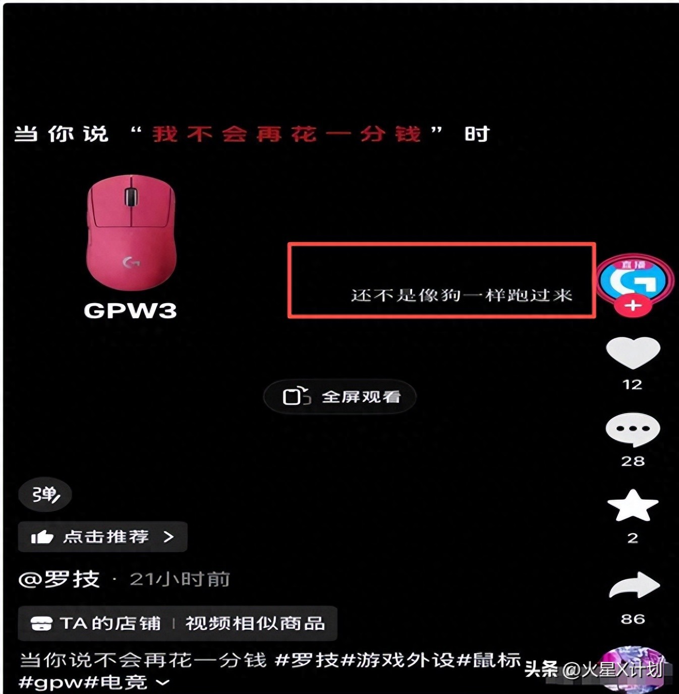 当天,罗技官方旗舰店在抖音账号上发布了一条关于旗下热门鼠标GPW3的推广视频,这本是一次常规的促销宣传,但视频配文却赫然写着:“当我一降价,你还不是像狗一样跑过来”。