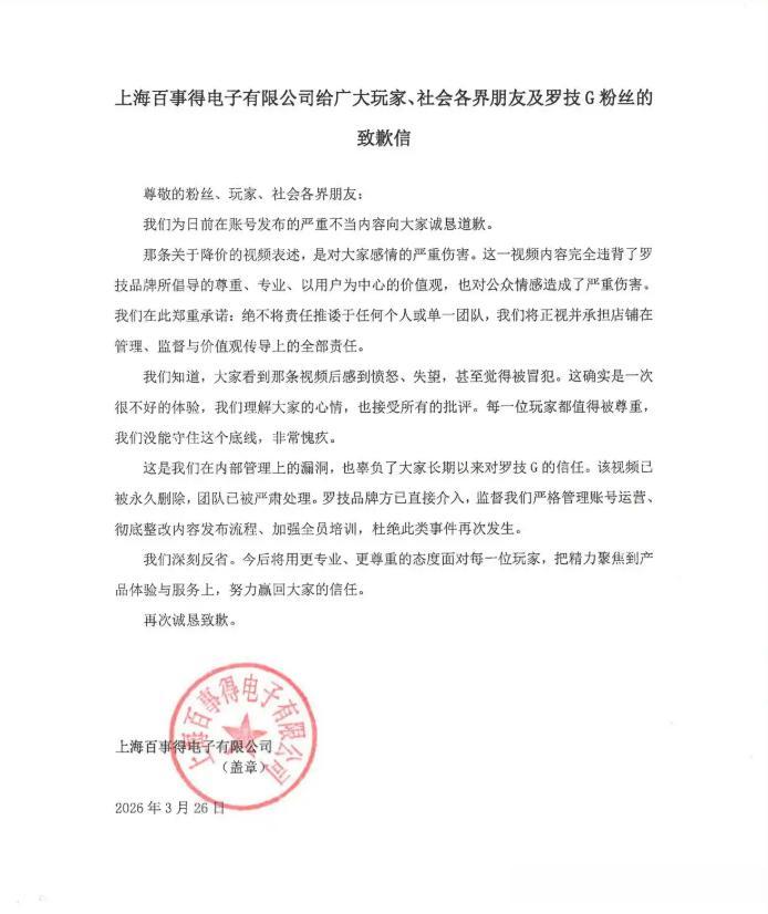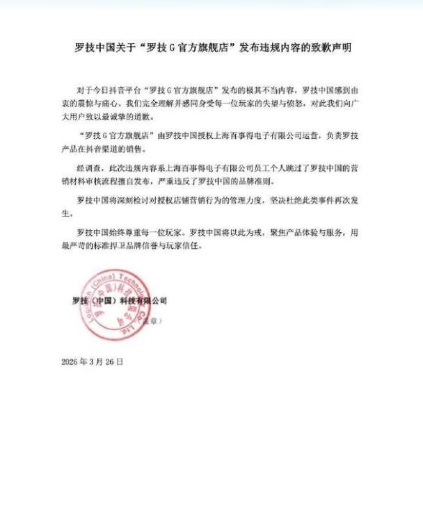 当晚深夜,罗技中国官方微博发布了一纸致歉声明,声明中透露,涉事的“罗技G官方旗舰店”由授权经销商上海百事得电子有限公司运营。