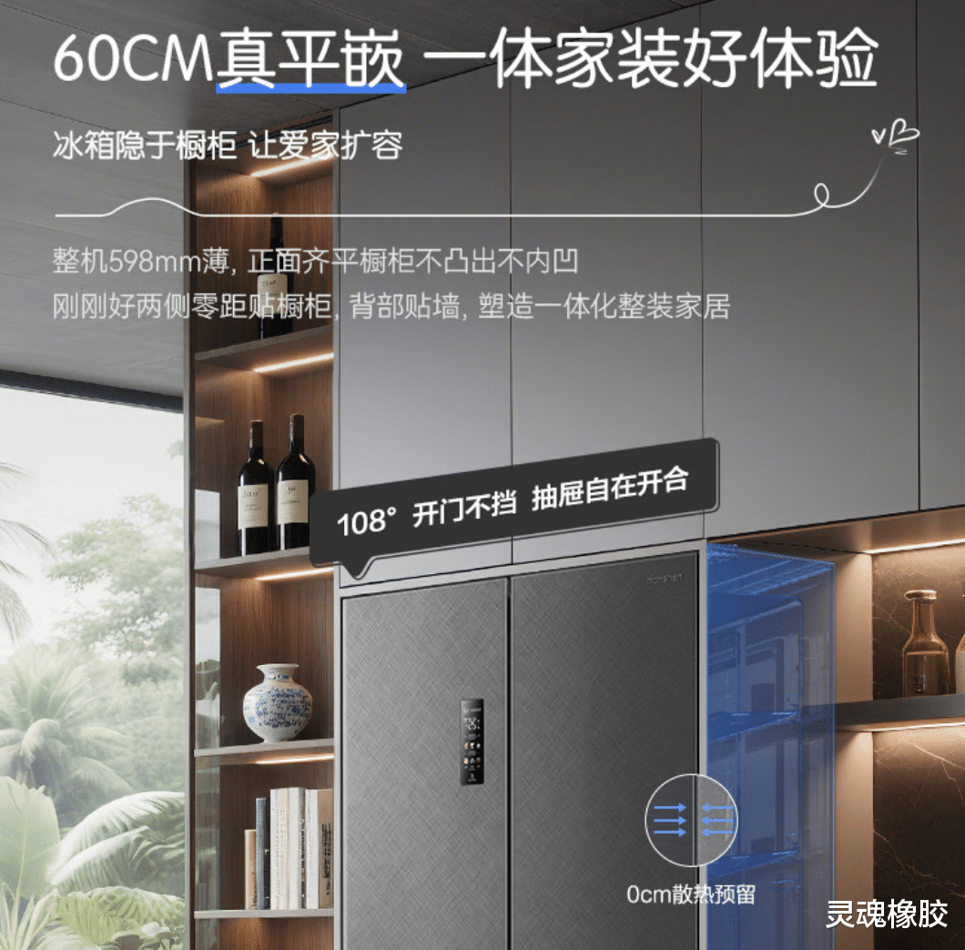 如何在有限的空间内获得更多的存储空间,这是一台好冰箱需要做到的。容声方糖505机皇,采用了真平嵌设计,与传统冰箱不同但是,其摆放时两侧不需要预留空间。整机进深598㎜,属于是超薄款冰箱了,冰箱背部紧贴墙面,完美契合各大橱柜的主流尺寸,并且采用了特殊设计的双轴变轨铰链,可以实现108°超广角开门,用着方便,不挡抽屉的使用。真平嵌式设计冰箱才是一体化整装的好选择。