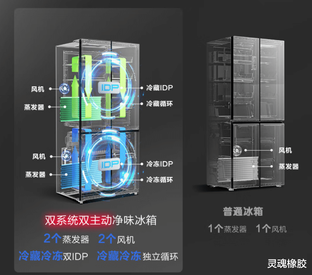 容声方糖505机皇冰箱,采用了先进的双系统、四循环制冷技术。这款冰箱的独特之处在于,冷藏室与冷冻室各自配备了独立的蒸发器,且每个蒸发器都对应有专属的风机进行循环送风。这样的设计使得两个系统能够独立运作,互不干扰,从根本上解决了传统冰箱中冷藏室与冷冻室食物串味的难题。