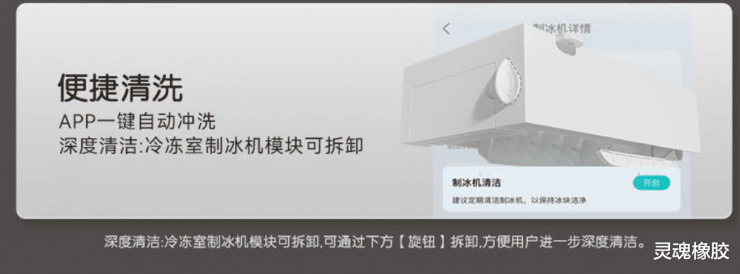 我家以前的带移动制冰盒的冰箱,清洗制冰盒是一件大麻烦事,而容声方糖505机皇的一键清洁功能,真的是深得我心,其模块化设计支持拆卸冲洗,避免传统制冰盒清洁死角,不仅支持将制冰机模块拆卸清洗,甚至支持APP一键自动冲洗简直是懒人的福音,深得我心啊!