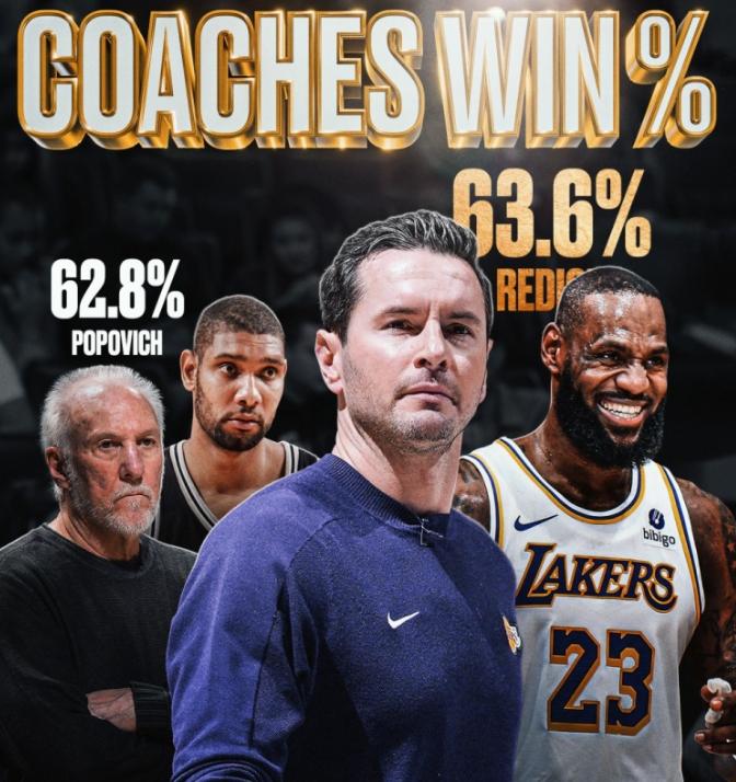 今日,据美国知名体育媒体《Basketball Forever》报道,湖人主帅雷迪克目前生涯执教战绩为63胜36负,胜率高达63.6%,比传奇教练波波维奇还要高(1390胜824负,胜率62.8%)。值得一提的是,雷迪克执教期间,当湖人在前三节打完取得领先的情况下,61战里取得了57胜4负的佳绩(93.4%),这是NBA自纳入统计以来最佳战绩。