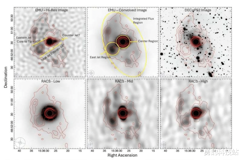 NGC 5938(Araish)的无线电和近红外观测。上排(从左到右)显示EMU高分辨率图像、EMU卷积图像和DECaPS2光学z波段图像。底排显示RACS低波段、RACS中段和RACS高波段图像,EMU高分辨率轮廓叠加在所有面板的3、6、9、12、15、25、50和75 σ,σ = 65μJy波束。图片来源:arXiv