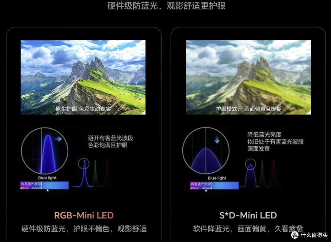 2、护眼效果:RGB硬件级防蓝光,SQD软件级护眼治标不治本如今家家户户都离不开电视,孩子上网课、老人日常追剧、上班族下班放松,每天看电视的时间都不短,护眼效果已成为选购电视的核心考量之一,而这一点,RGB和SQD的差距更是天差地别。