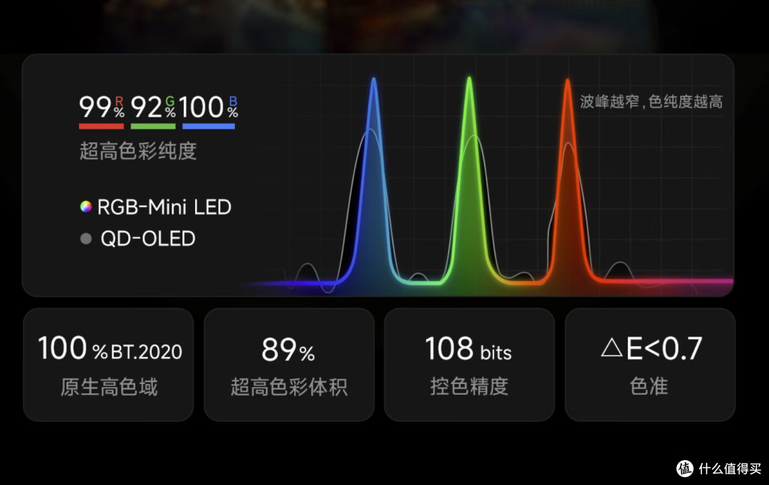 值得一提的是,优质RGB-MiniLED(如海信RGB机型)的三原色发光芯片,能提供比量子点更窄的半波宽,只有合适的波长与极窄的半波宽结合,才能实现超广色域和超逼真色彩,同时保证色彩稳定性。而有些廉价RGB机型只用两种颜色的发光芯片+荧光粉,红色峰太宽,色彩不够准,亮度还会快速衰减;SQD机型的色彩衰减问题则更严重,使用1-2年就会出现明显色偏、色彩暗淡,越用越闹心。