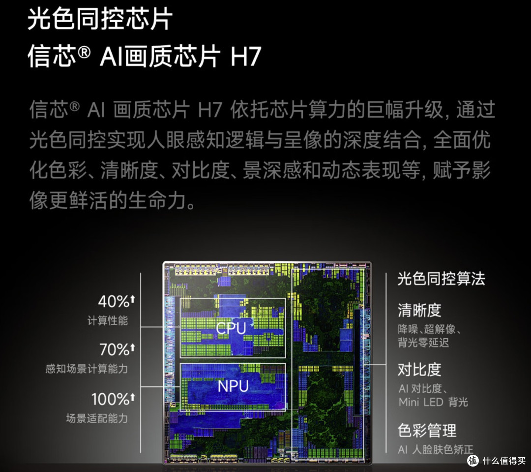 此外,它搭载海信独家信芯® AI画质芯片H7,实现光色同控,拥有108bits调光精度和9360个高分区,能实现3×10240级的精准分区控制,色彩串扰几乎没有,做到亮场不发白、不偏色、不衰退,暗场细节清晰,层次感更强,高速运动画面也不会出现串色、拖影,色彩边缘清晰、过渡丝滑。