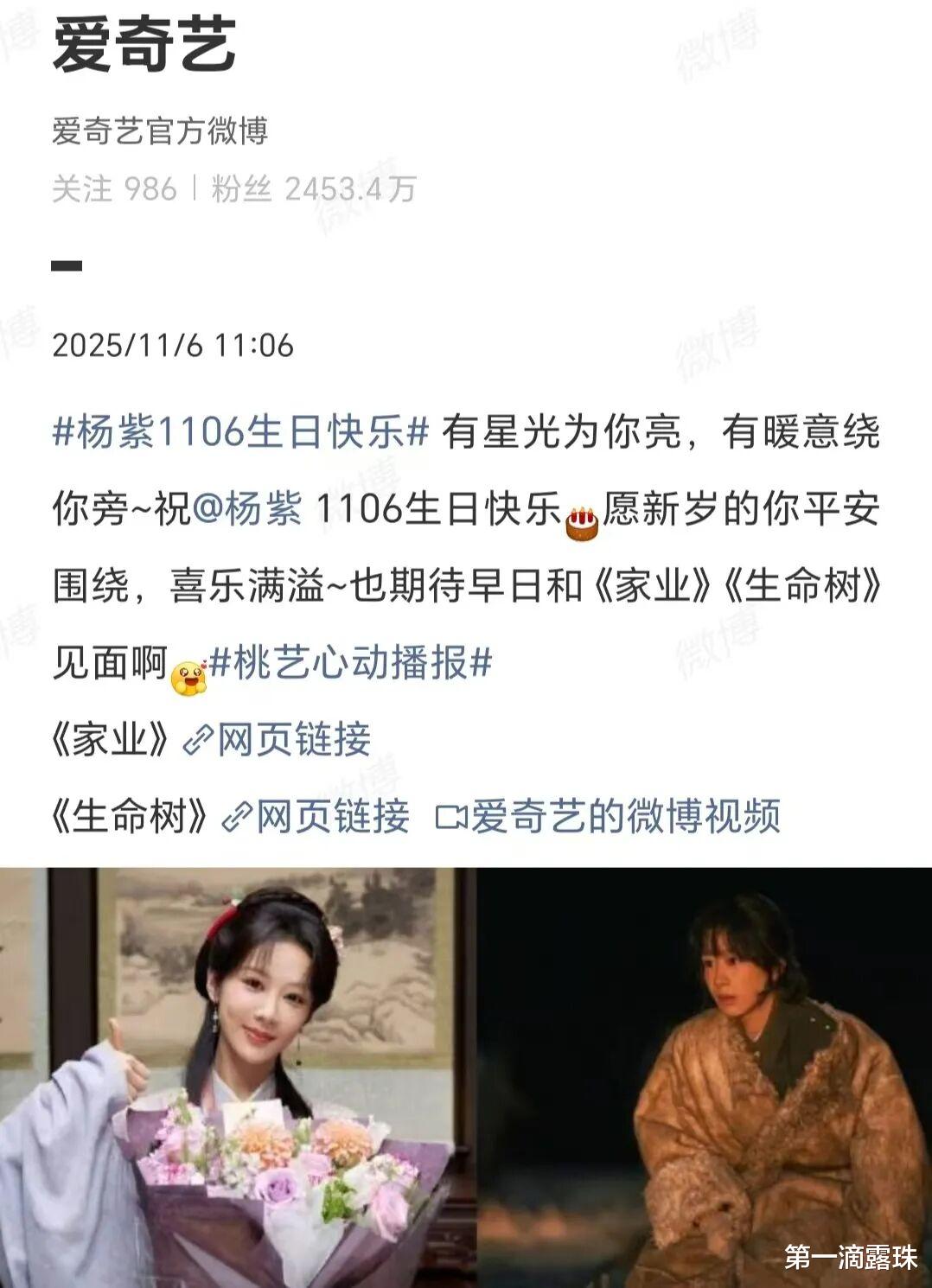 爱奇艺是这样祝贺的:有星光为你亮,有暖意绕你旁,祝杨紫11.06生日快乐!愿新岁的你平安围绕,喜乐满溢,也期待早日和《家业》《生命树》见面啊。