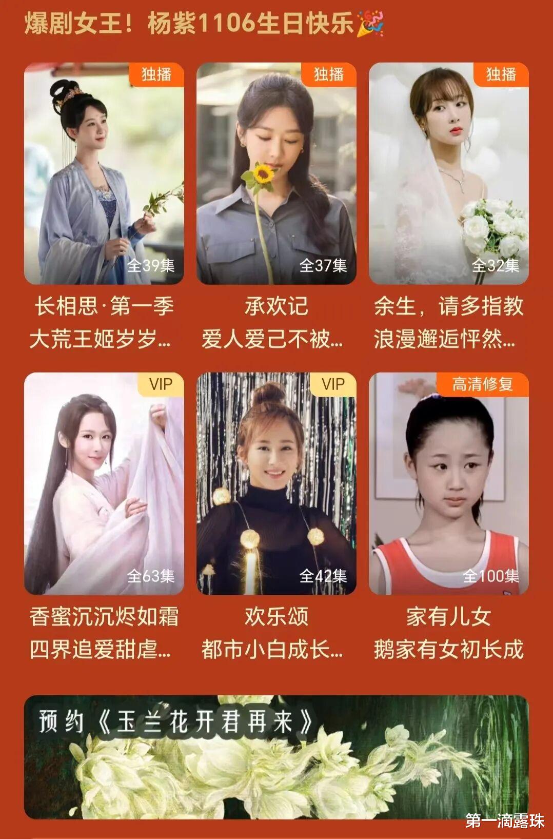 庆生专栏中,专门列出了杨紫的爆款作品:《长相思》《承欢记》《余生请多指教》《香蜜沉沉烬如霜》《欢乐颂》《家有儿女》,以及杨紫的预约新剧《玉兰花开君再来》。
