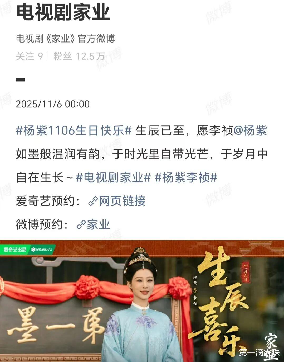 《家业》剧组,在《家业》官微为杨紫庆生:杨紫11.06生日快乐!生辰已至,愿李祯@杨紫,如墨般温润有韵,于时光里自带光芒,于岁月中自在生长。