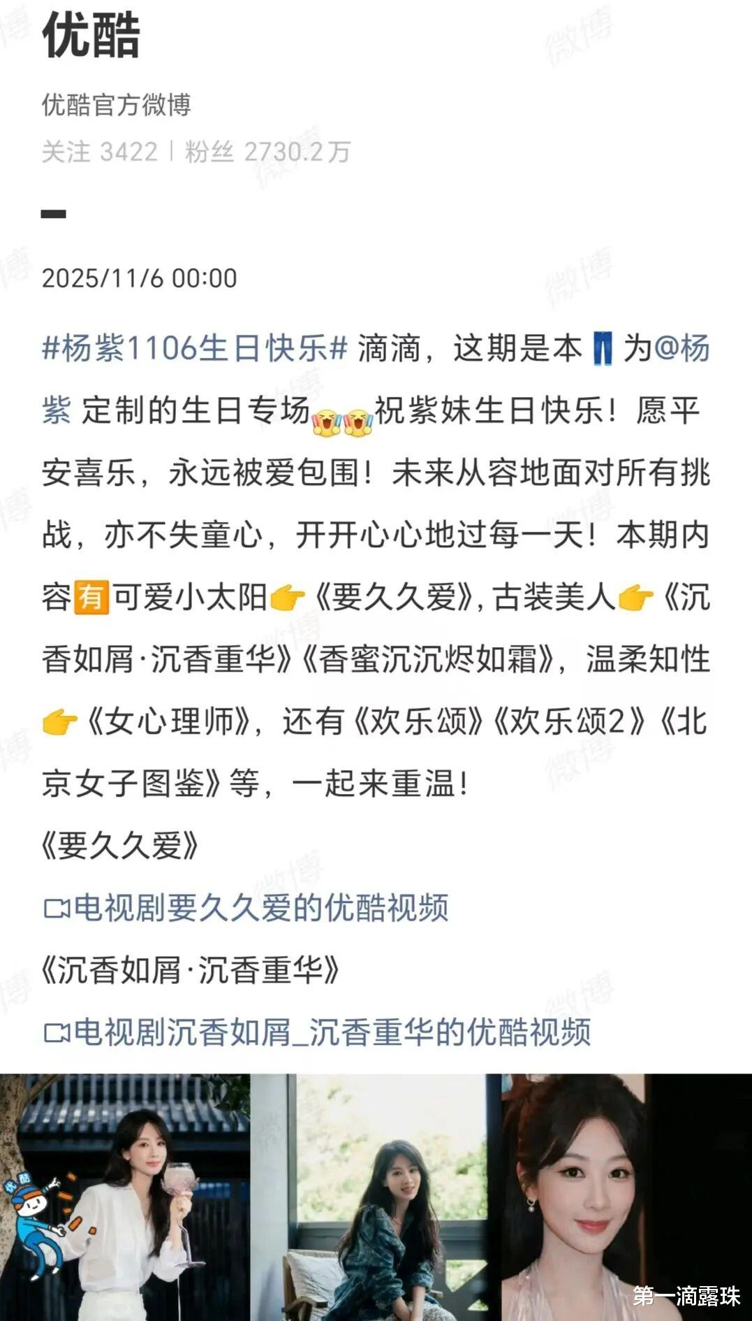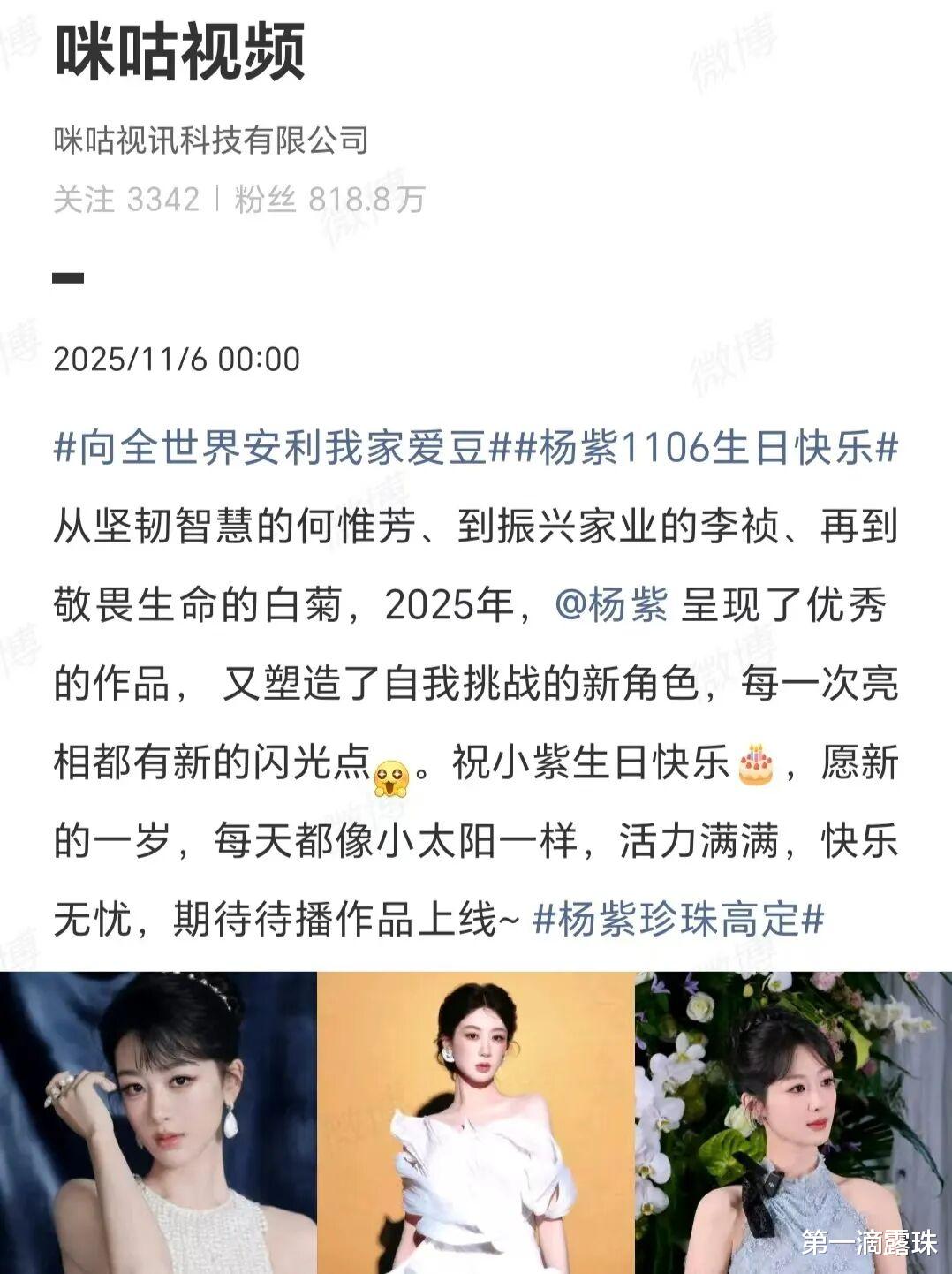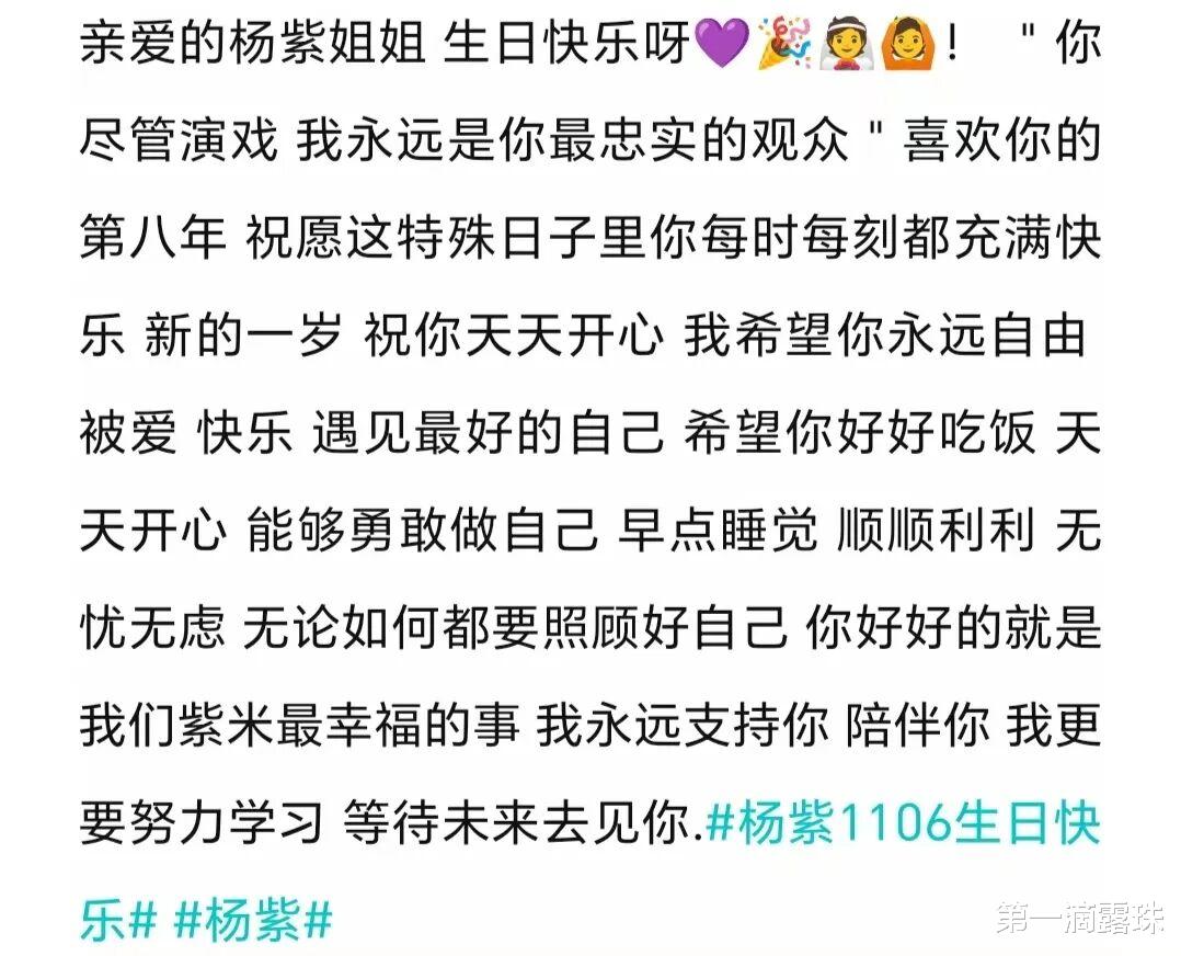 11月6日,演员杨紫33岁生日,各大平台、粉丝、明星和剧组等,纷纷发文为杨紫庆生。