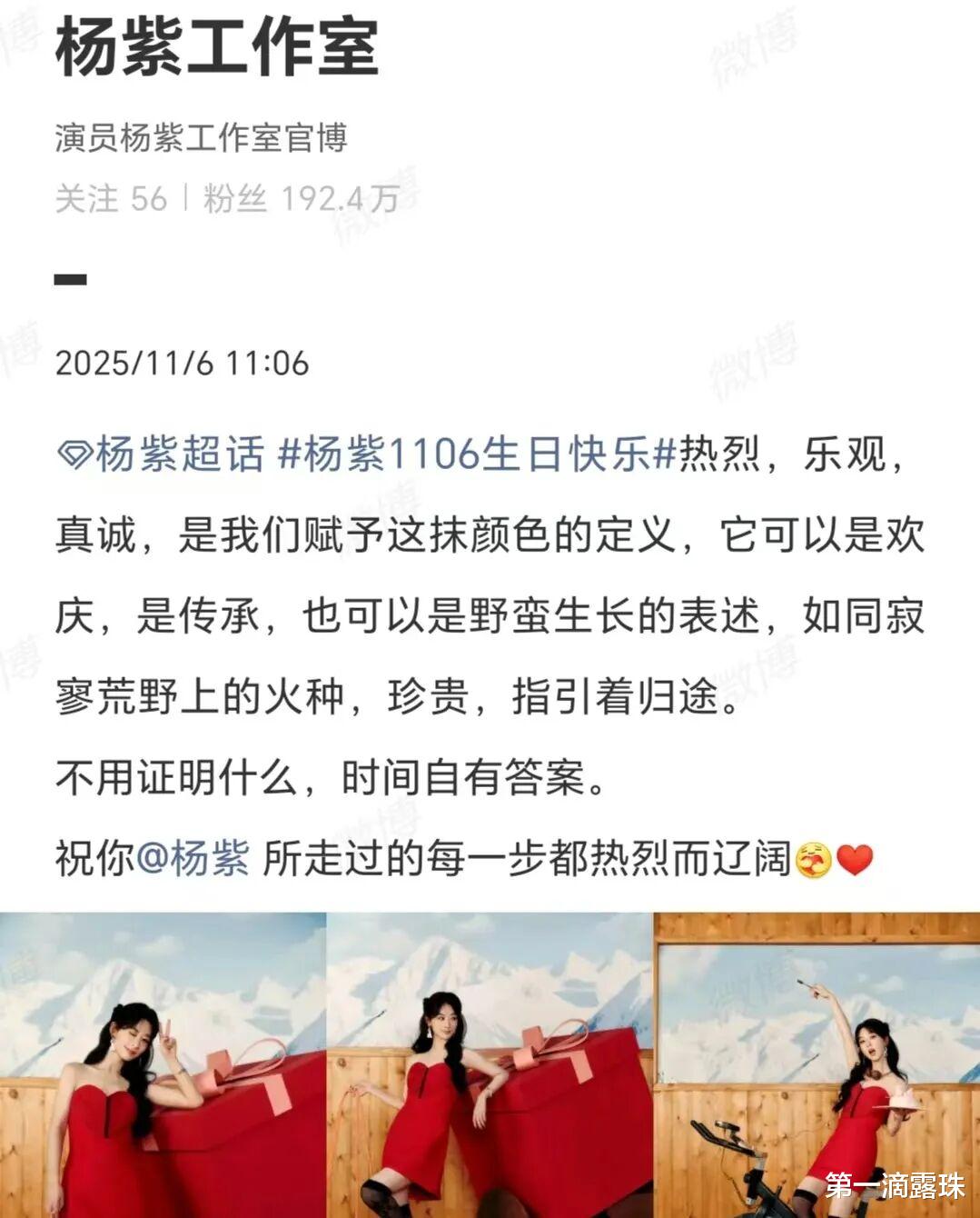 杨紫工作室连续发文为杨紫庆生:热烈,乐观,真诚,是我们赋予这抹颜色的定义,它可以是欢庆,是传承,也可以是野蛮生长的表述,如同寂寥荒野上的火种,珍贵,指引着归途。