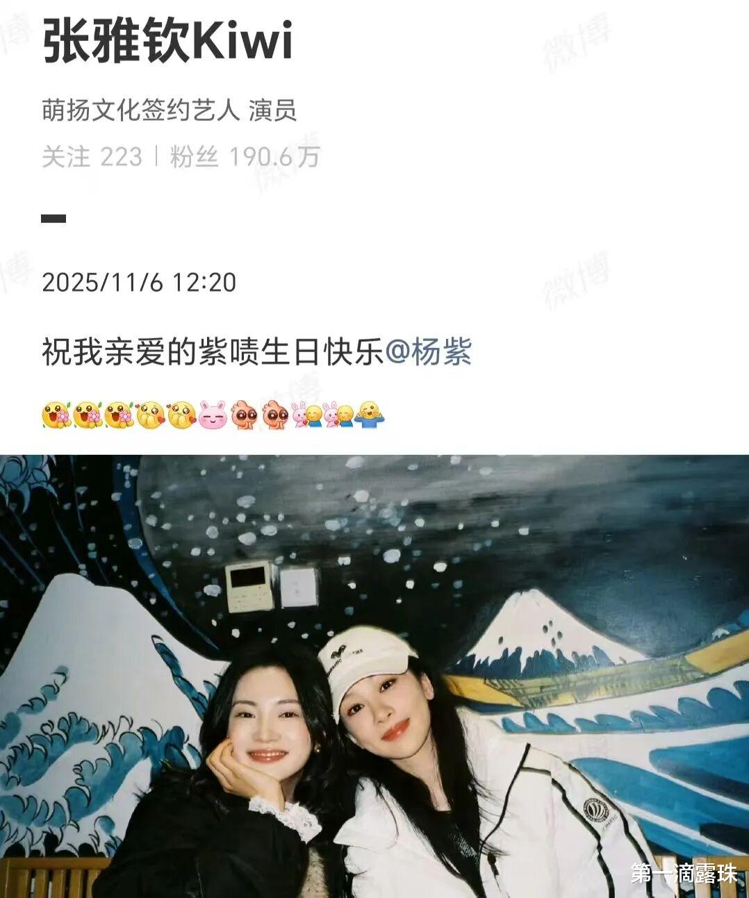 演员张雅钦也在个人社交平台,发合照为杨紫庆生:祝我亲爱的紫啧生日快乐!