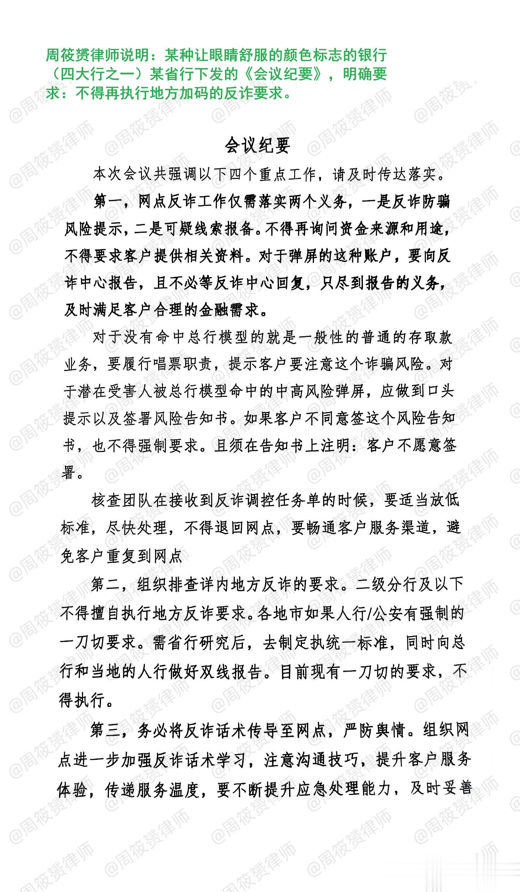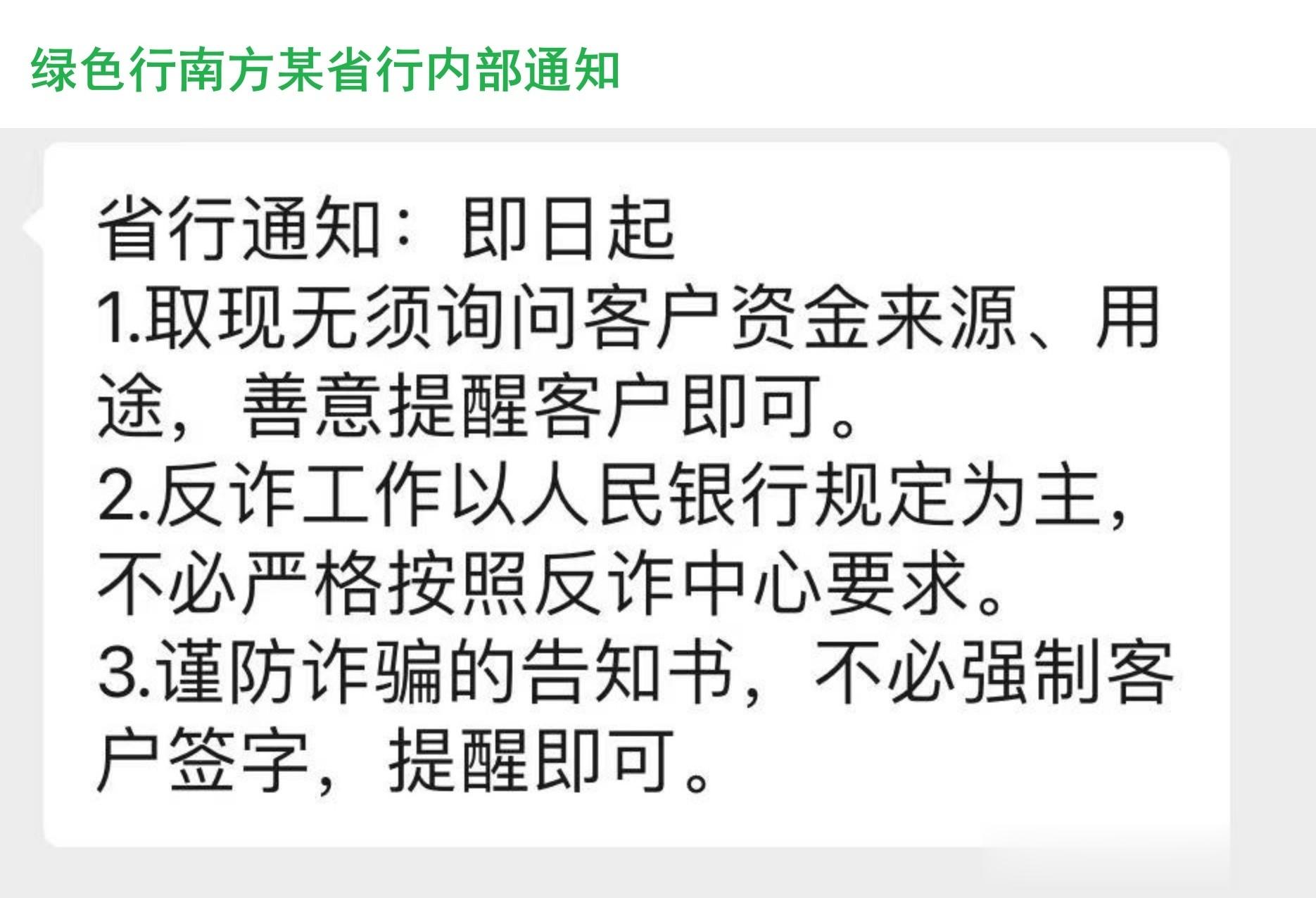 之前,我曾表扬过绿色行北方某省行,早在11月14日就发出内部《会议纪要》,要求停止执行现有地方一刀切的反诈要求。