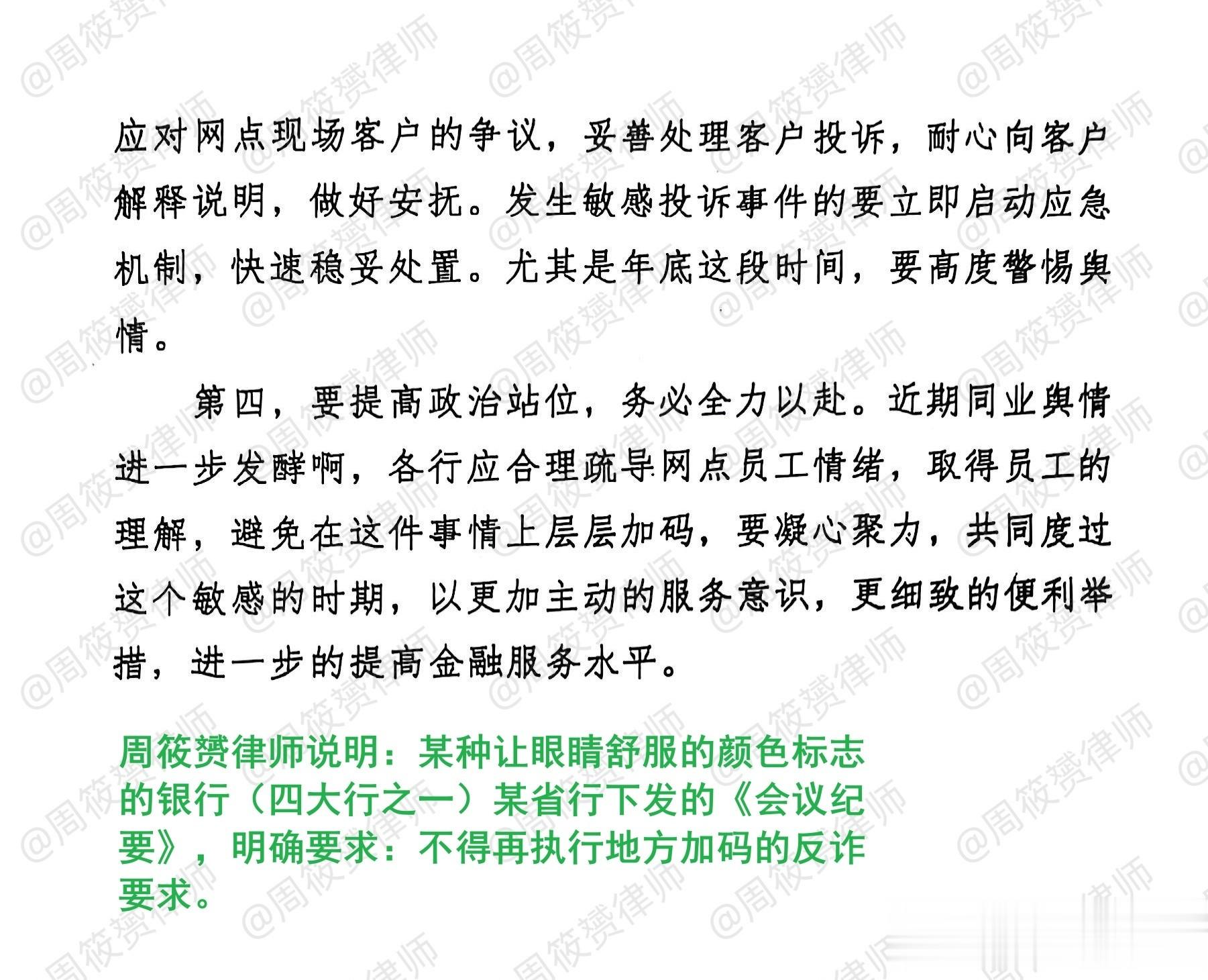 现在,蓝色行不仅没有落实央行的新规,还继续发出各种内部通知,要求加强反诈,压榨基层员工。当然,据我所知,不仅是蓝色行,还有其他银行,也在继续对抗央行的要求。