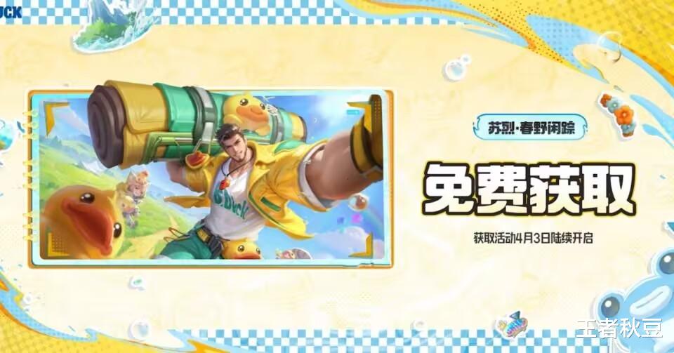 苏烈也在这次联动中获得新皮肤,在4.3日活动开启后可以免费获取。从宣传图中可以看出苏烈化身沙滩大叔,武器变成了沙滩席子,大胆猜测技能特效也将与水和鸭子有关。