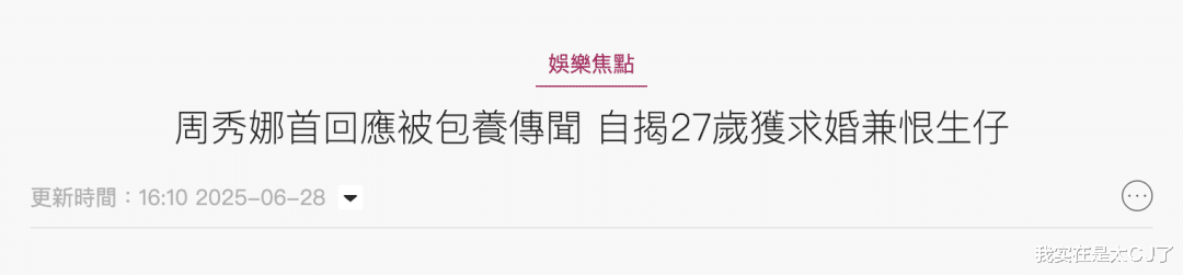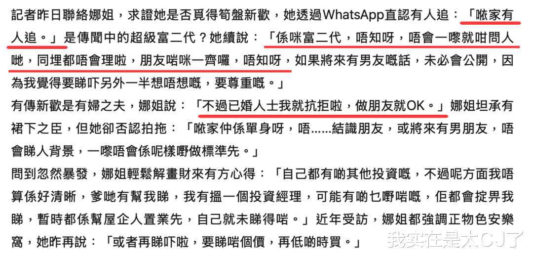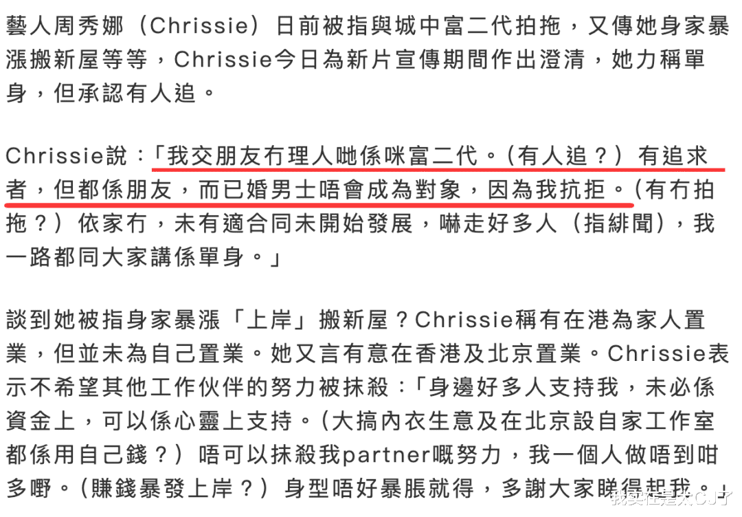 虽然周秀娜面对不同媒体问询都在强调自己抗拒已婚人士,现在肯定有人追但对对方身家背景完全不了解👇