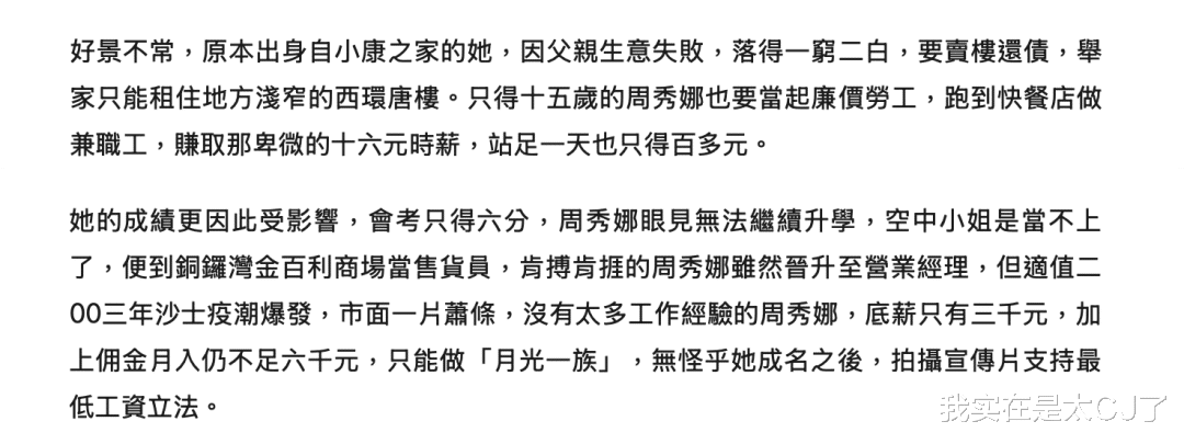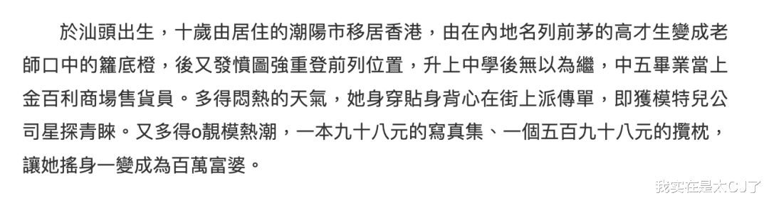 虽然她并不是读不了书,而是先后经历了十岁随家人从汕头移居香港要重新适应环境与教学、父亲生意失败要卖楼还债等巨变,十四五岁为了补贴家用到处打工影响会考,才放弃升学念头。