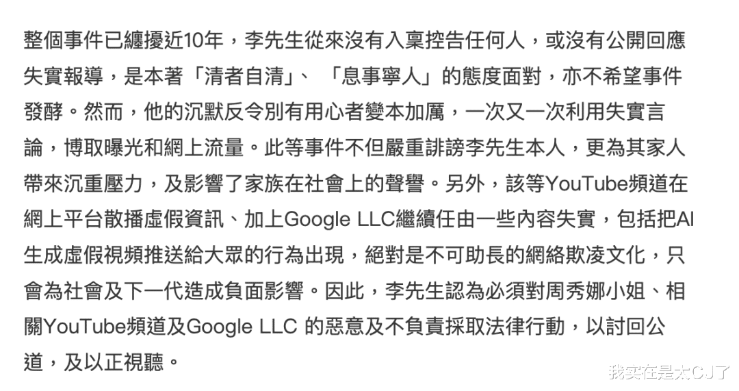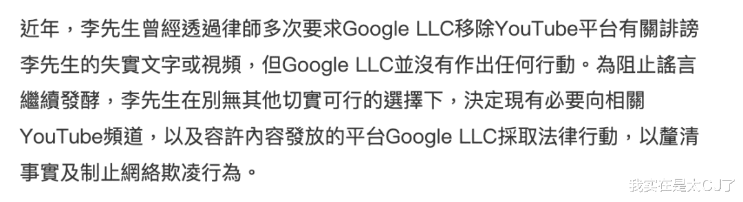 当然周秀娜不是唯一被告,李家诚还告了5个油管频道以及平台背后的谷歌公司,因为他之前多次通过律师要求谷歌移除或者下架那些和自己有关的谣言内容,但谷歌不行动。