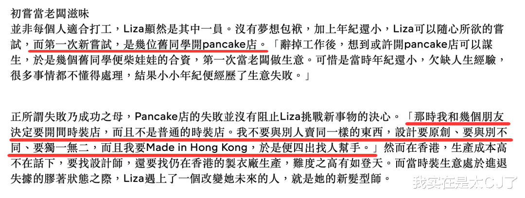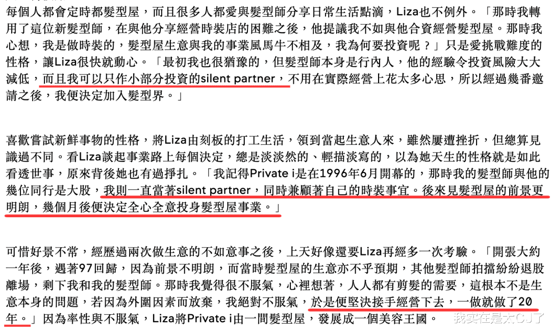 张韵嫦在后期采访中淡化了创业初期的资金来源,尤其是一听投资就不会低的时装店那段,只强调最初做发廊的时候自己还没放弃时装事业所以就入了一点股份,做了一段时间发现有前景才开始全职打理。