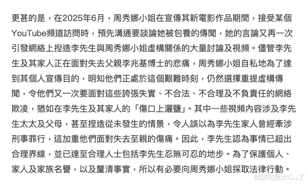 这已经是很严重的指控,李家诚还加码指责,说去年6月周秀娜为宣传新片接受采访,预先沟通可以聊被包养传闻,又引来大规模讨论,是在正为李兆基离世伤痛的李家人伤口上撒盐。