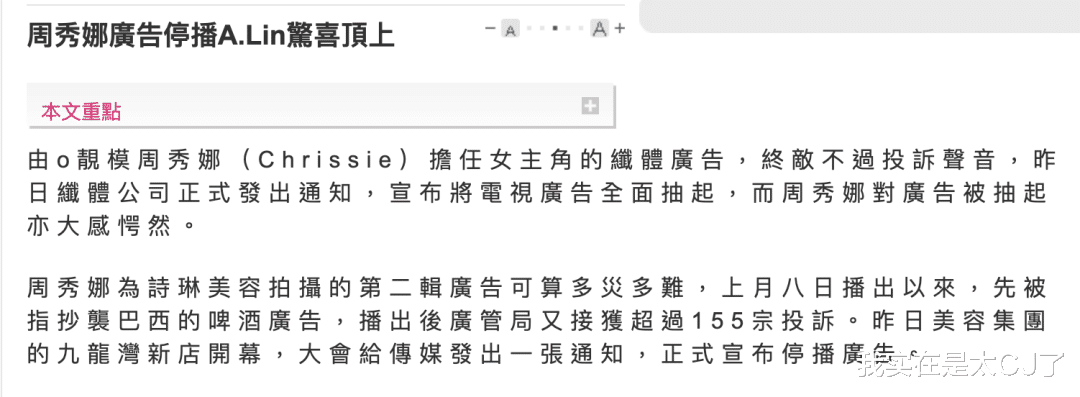 虽然诗琳公司事后表示周秀娜代言有效刺激了公司营业额提升,效果非常出挑,但因为香港不少家长投诉,诗琳很快又找别的模特拍新广告作为代替。