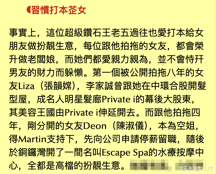 据说和李家诚认识后,Deon就跟公司申请停薪留职,然后在对方支持下做起了铜锣湾spa馆的老板娘。