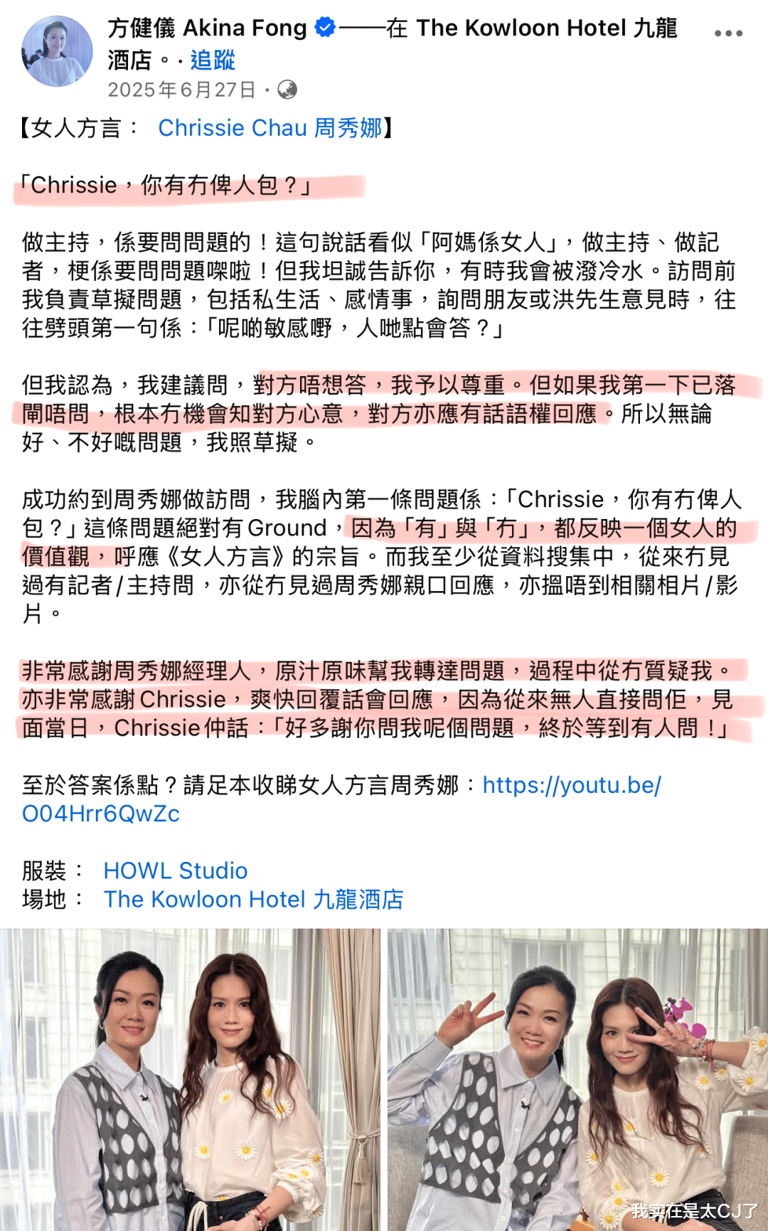 采访上线时方健仪特意分享这段背后故事,一是因为节目选择在标题、在开头位置就抛出劲爆话题来起到引流效果,难免要解释一番自己这么做的用意;二来是因为周秀娜爽快答应也说明受访者对她有信任,更让她庆幸自己赌对了。