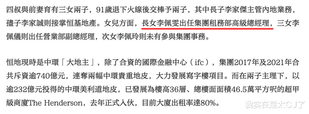 因为李家这一辈公认能力最强的其实是长姐李佩雯,1984年从英国学成归来后加入恒基,主导的租务投资项目营收数字非常抢眼。