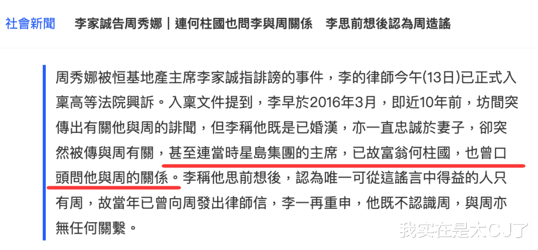 当时各地媒体转载这段也都是说周秀娜首次回应澄清,没有半点炒绯闻的意思,不知道李家人是从哪里看到那些“涉及李家诚太太及父母”的、“让人误以为李先生家人曾牵涉刑事罪行”的讨论视频。