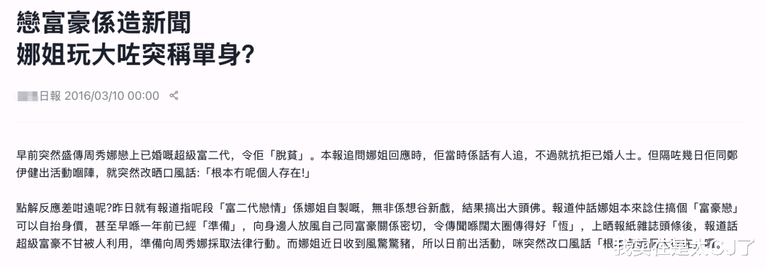 可是看看界面,匿名爆料平行时空有超级富二代恋上女明星的、正儿八经报道周秀娜否认的、接到线人消息说周秀娜自炒的、刊登娱记连载说李家诚徐子淇不堪其扰的……都是同一家,是大名鼎鼎的水果日报。