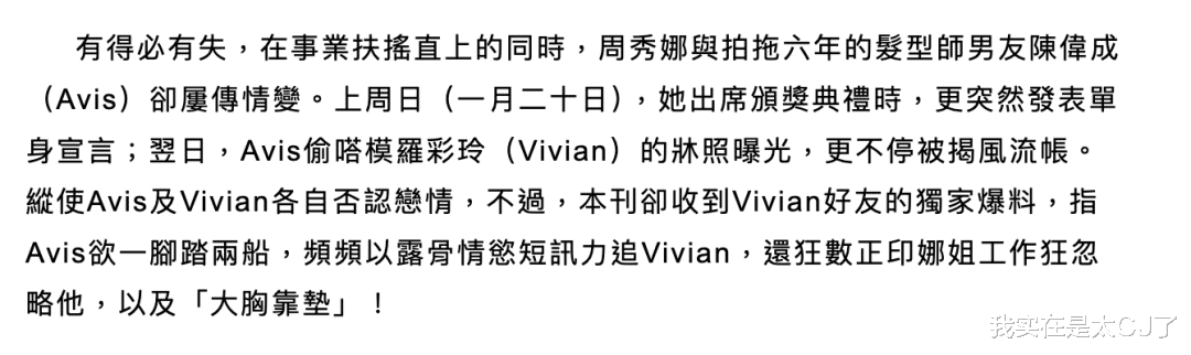 哪怕周秀娜出道时就公开了自己和发型师陈伟成的恋情,交往六年因为步调不同而分手,看前后各种报道都能感受到错在男方👇
