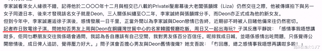 现在外界流传李家诚故事里,大多都会神神秘秘这个“空姐”,因为她不仅跟张韵嫦那段有时间重合,2004年徐子淇甜蜜认爱李家诚后,江湖上依然处处是Deon的传说。
