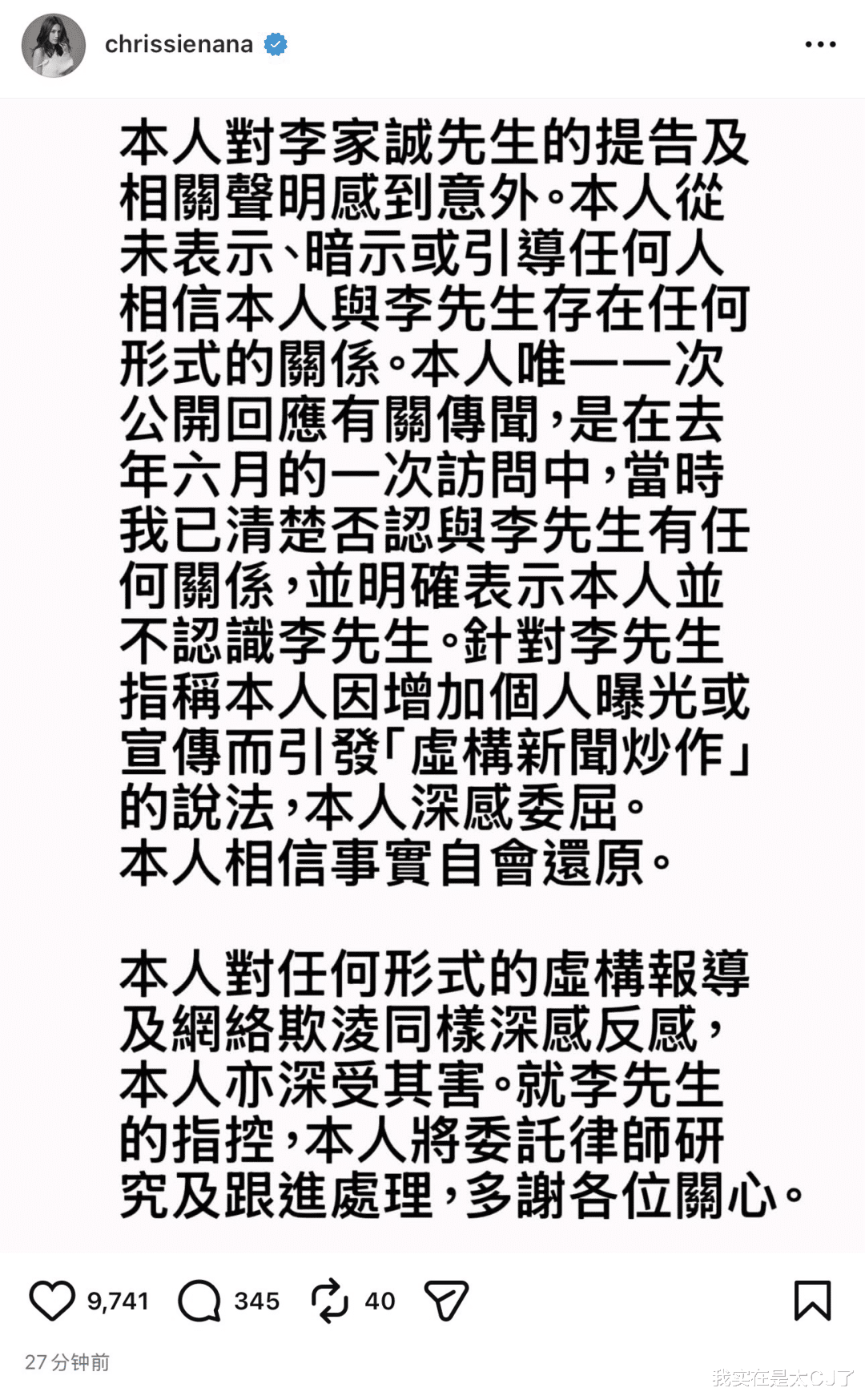 李家诚说自己忍了十年,从来相信“清者自清”,但沉默退让并未让谣言停止。所以现在既然要告,就一次告齐,坐享其成者、造谣主力军和放纵不管的平台……一个都别想跑。