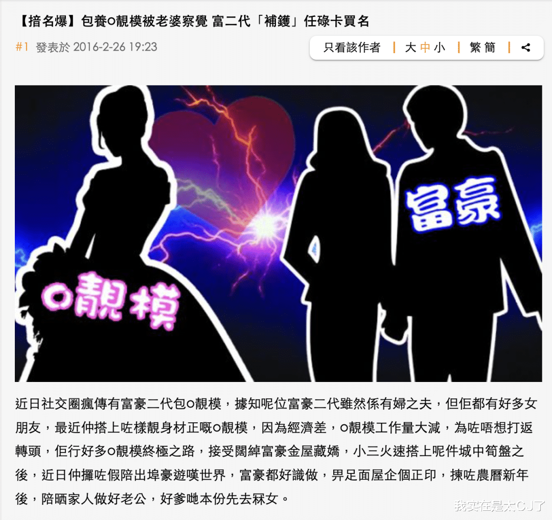 传闻发端还不是李家诚方面提到的《东方新地》952期,而是坊间流传,具体已经不可考。我能找到最早的出处是2016年2月,有媒体不点名爆料称,有位富二代虽然已婚但在外面也是彩旗飘飘,近期更是包养了一个身材很正的“𡃁模”(内地报道常提到的“嫩模”)。