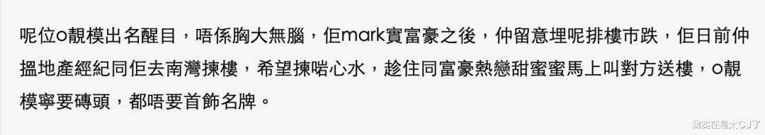 按照爆料所述,这位嫩模是因为工作大减才接受包养,而且很懂得给自己留后路,不要名牌首饰,看到房价下跌就马上去南湾看房,希望趁男方浓情蜜意时要到套房。
