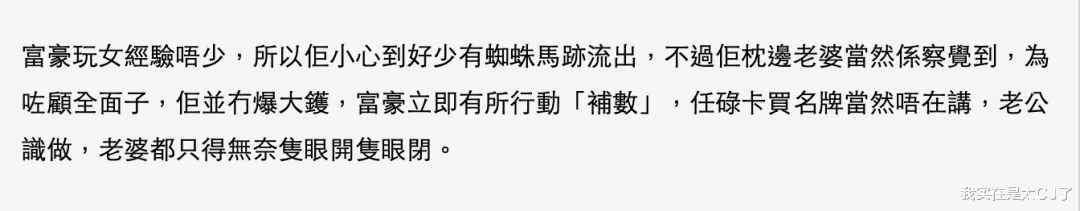 虽然富二代有很多偷食经验也非常小心,但还是被太太发现,只是顾全面子没有出来闹。所以心虚的富二代也大方让老婆刷卡买买买,让太太继续睁一只眼闭一只眼。