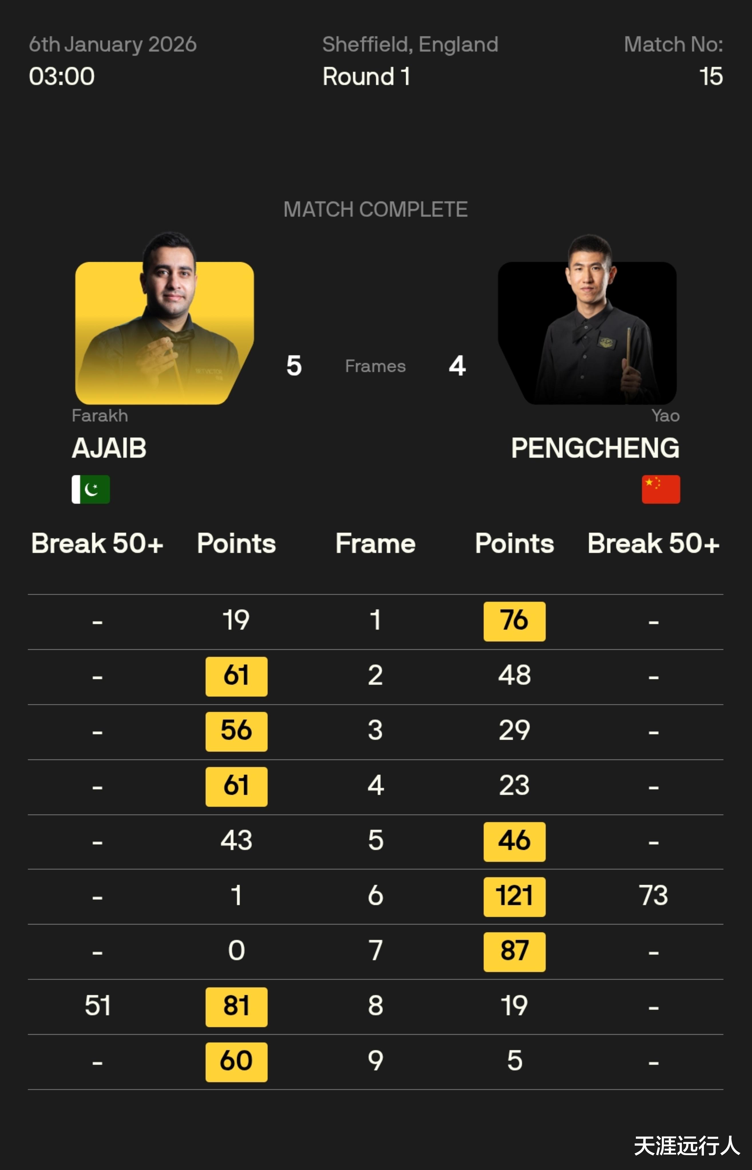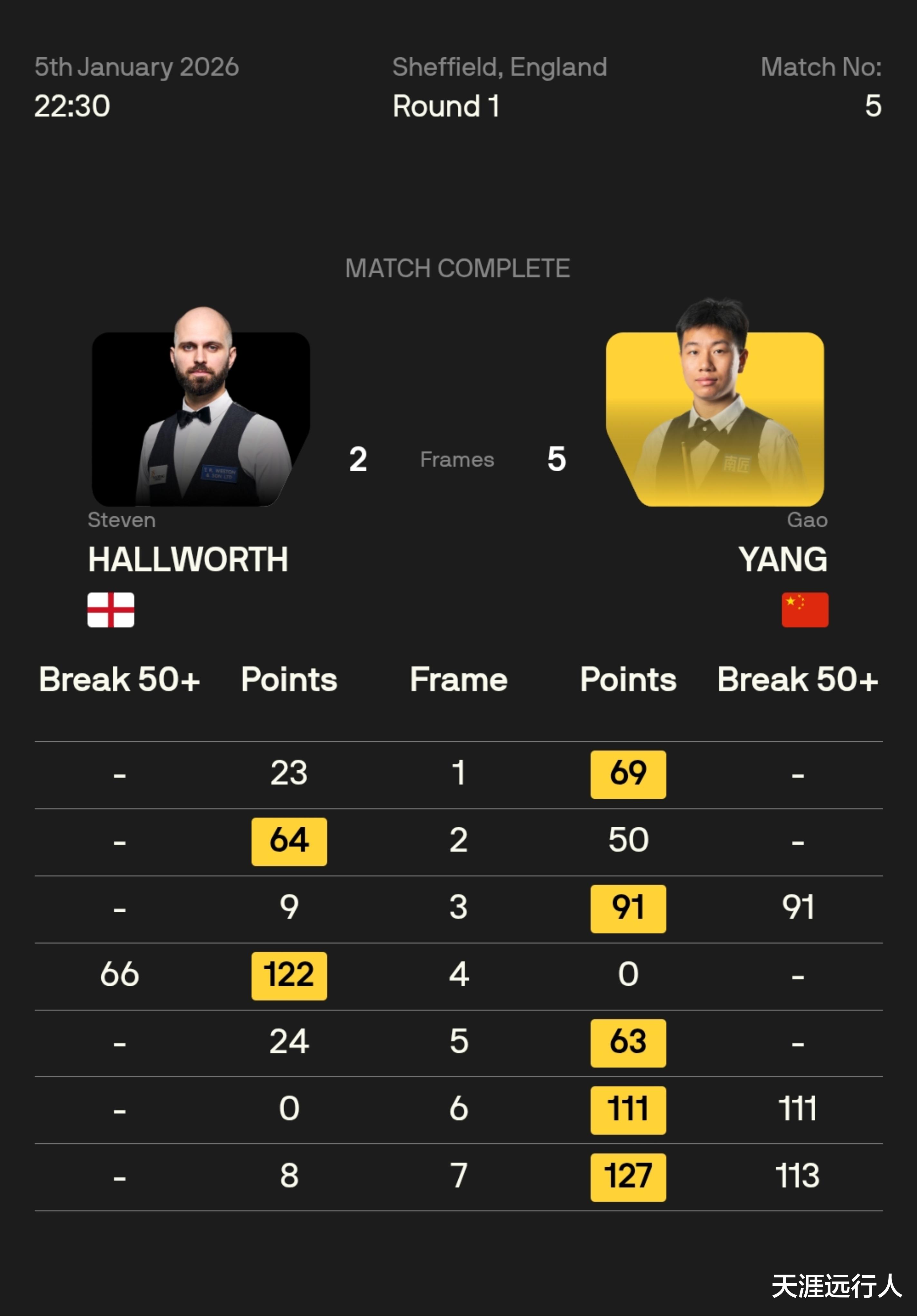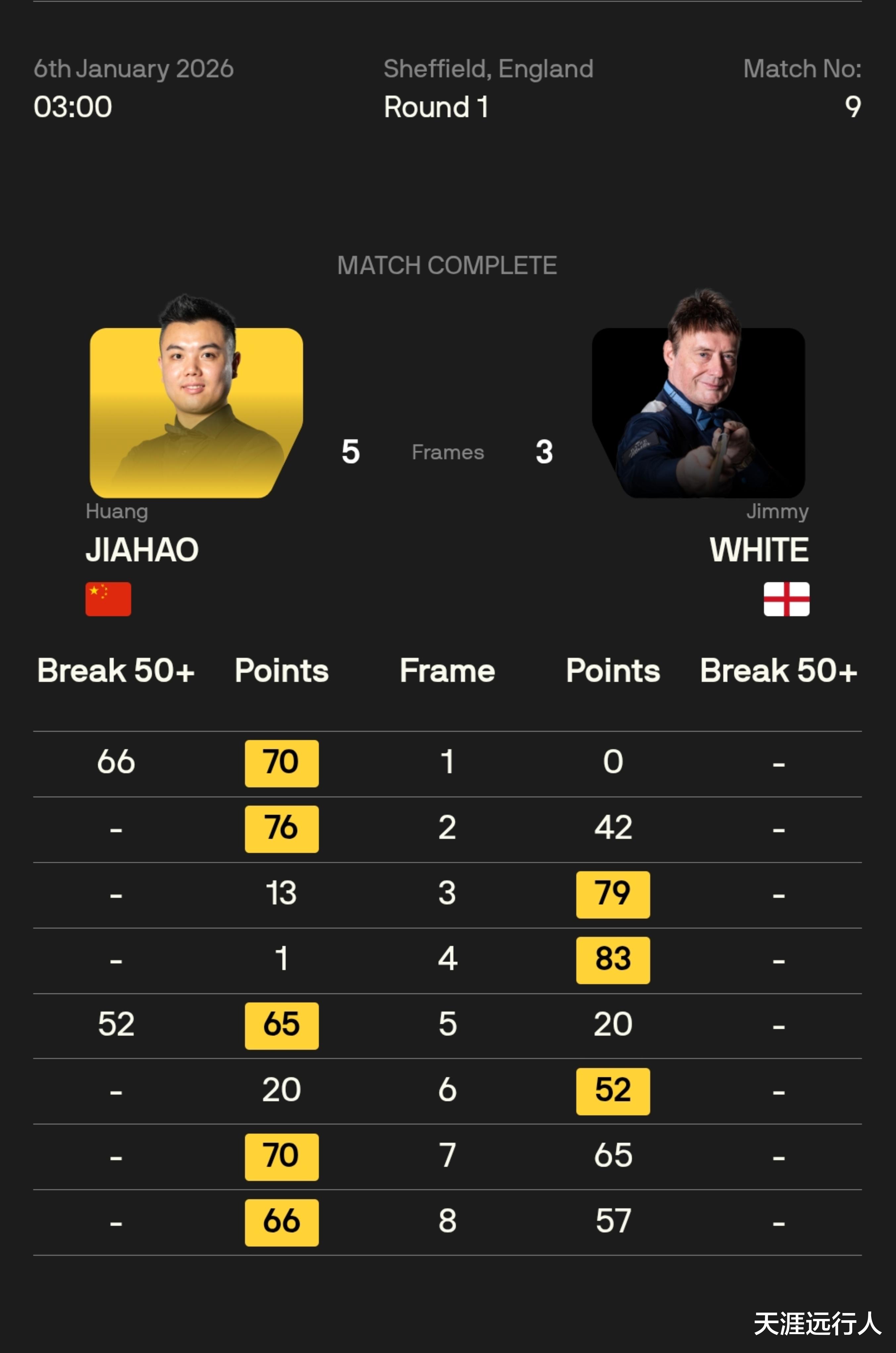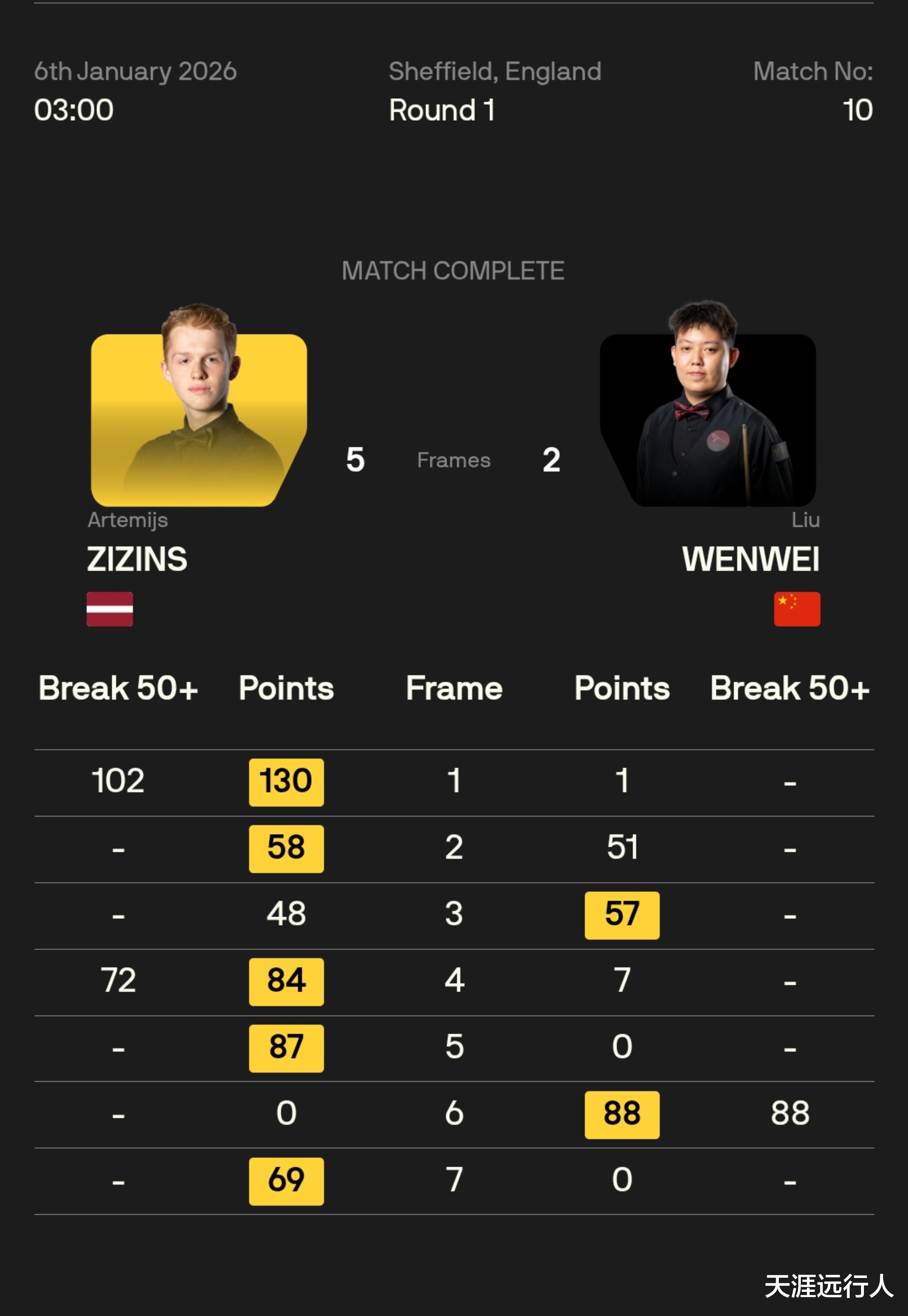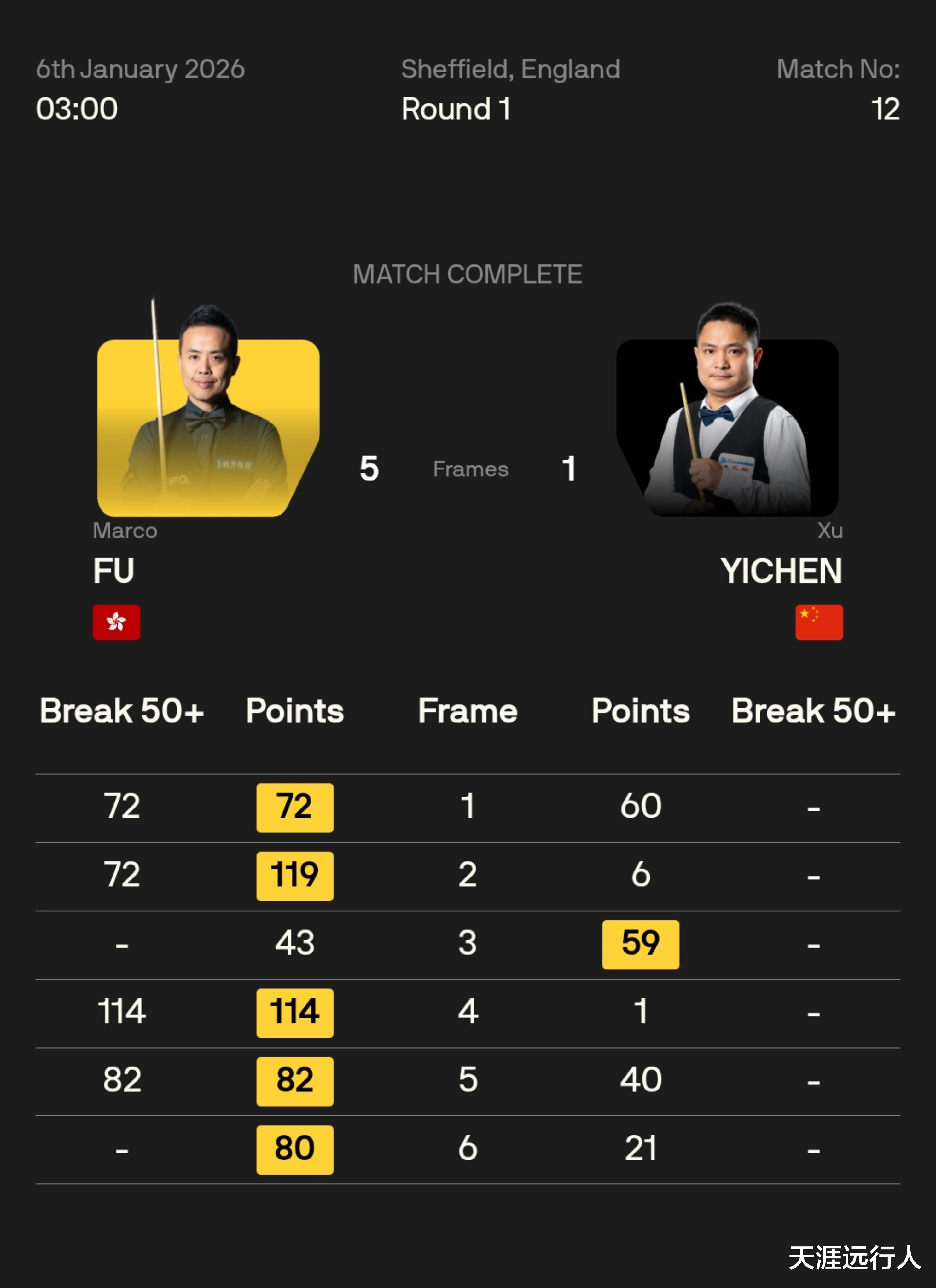 北京时间1月6日凌晨7时12分,2026斯诺克德国大师赛资格赛首轮128进96轮次前半程的16场角逐,在英格兰谢菲尔德全部决出了胜负。