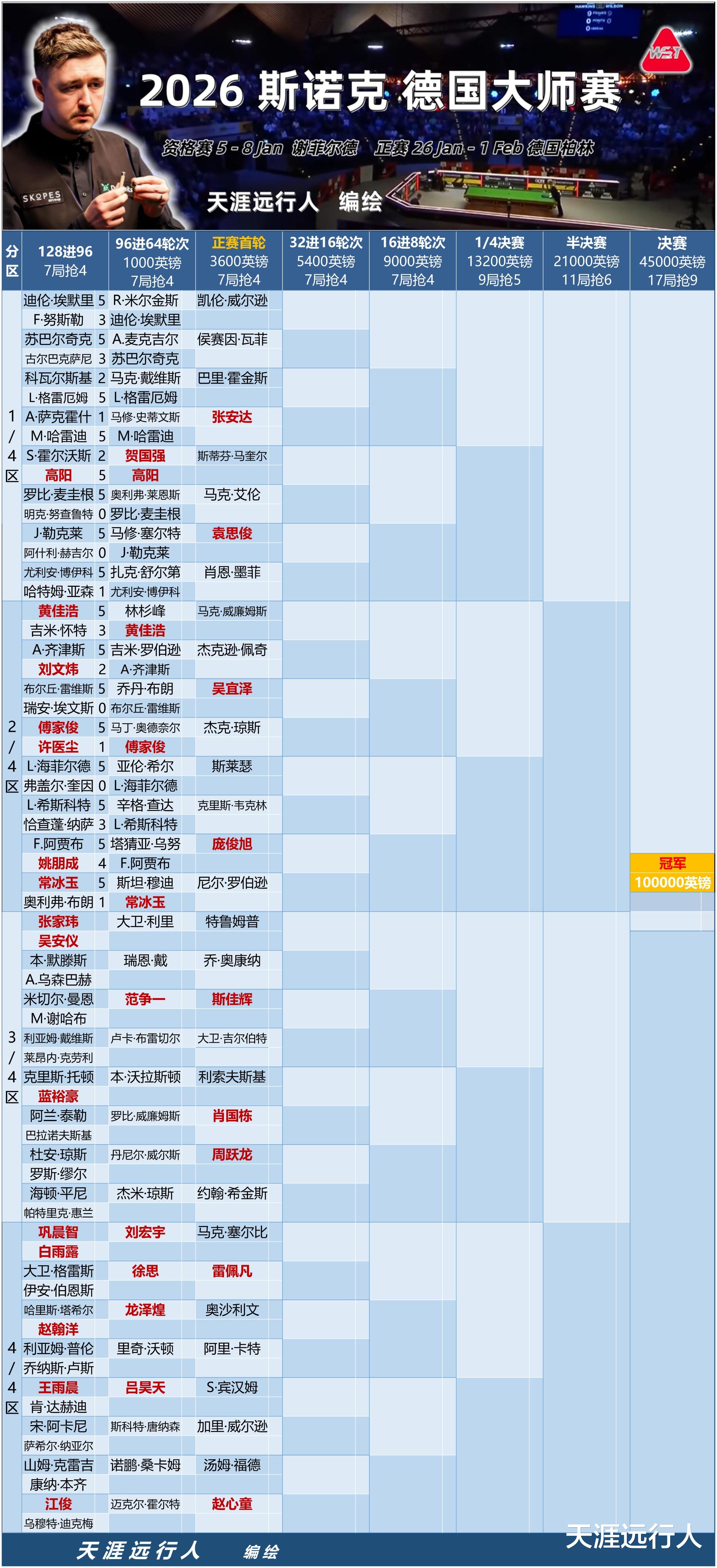 最新即时更新2026斯诺克德国大师赛进程签表,一表看德国大师赛全程,各位看官老师敬请转发收藏,以备不时之需。