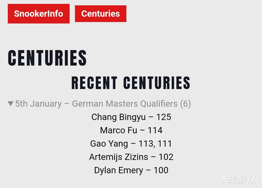 德国大师赛资格赛首日,出场的32位球员共打出六杆单杆过百,三位中国球员打出其中的四杆,高阳两杆,傅家俊、常冰玉各打了一杆,常冰玉的单杆125分暂据赛会的单杆最高分。